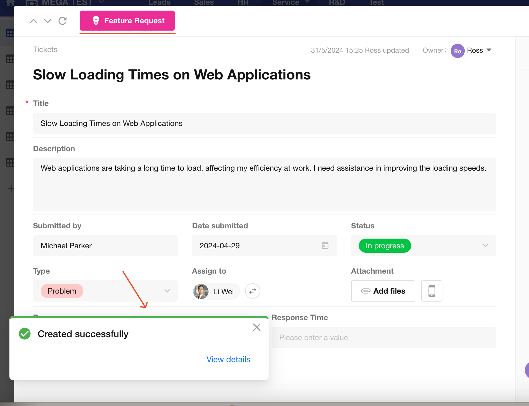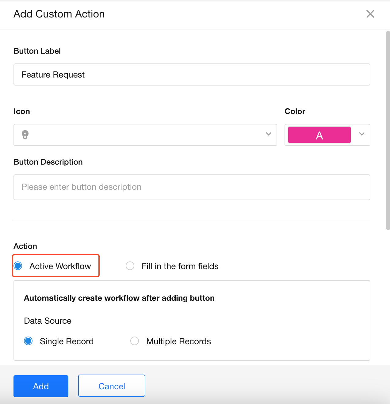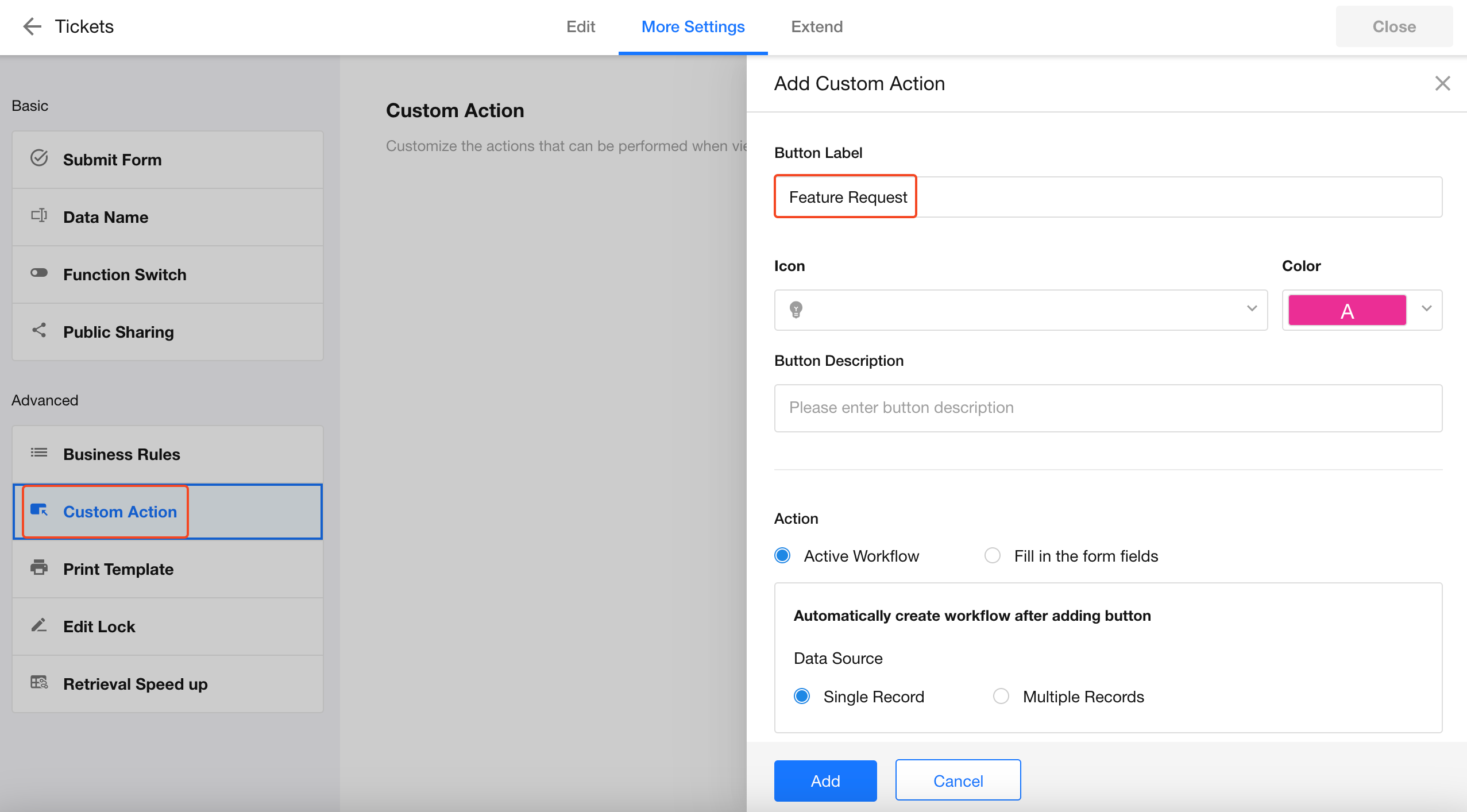Example 1: For a ticket record, if customer service personnel identifies it as a feature request, clicking a button to automatically create a feature record and open it.