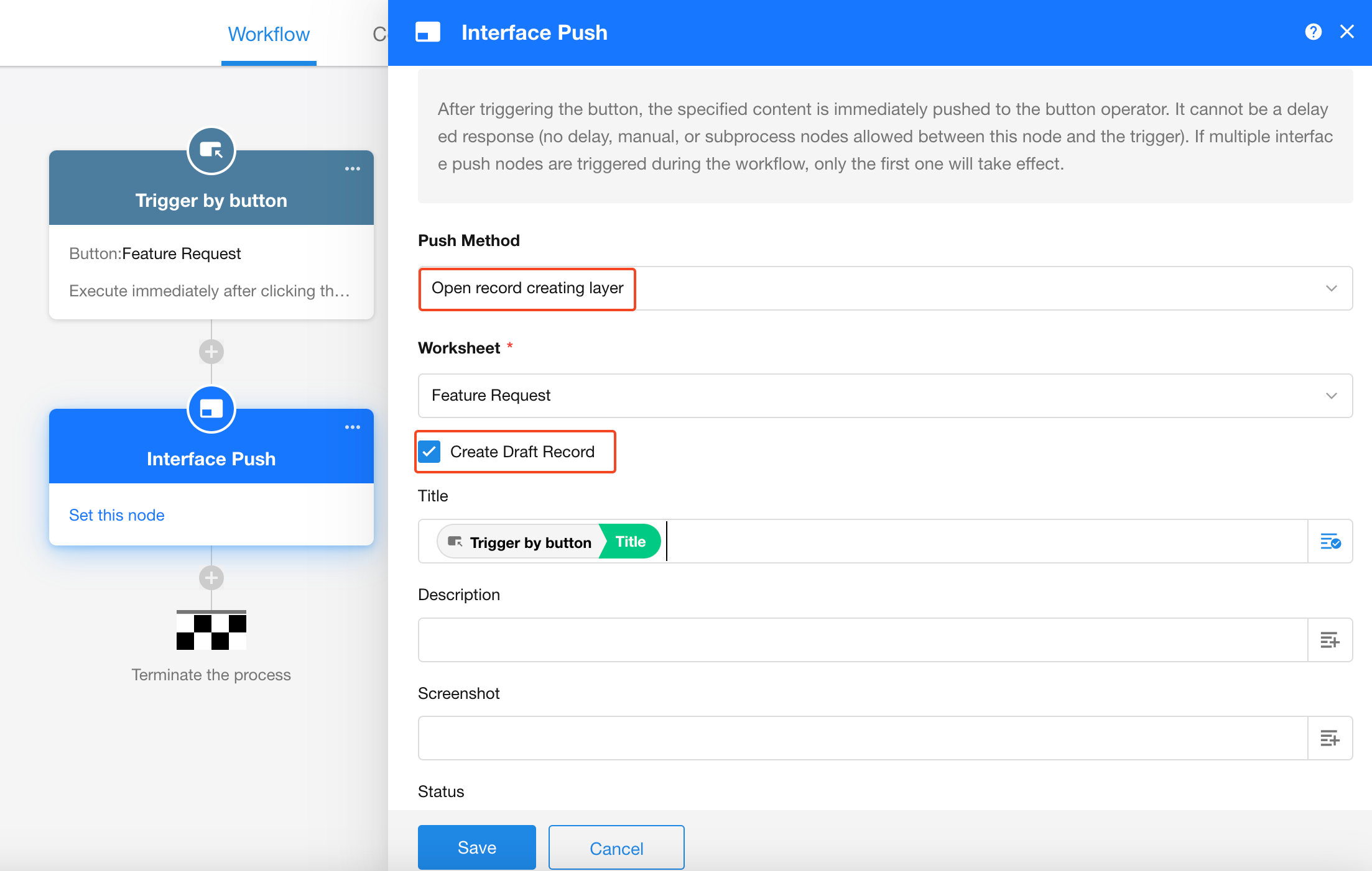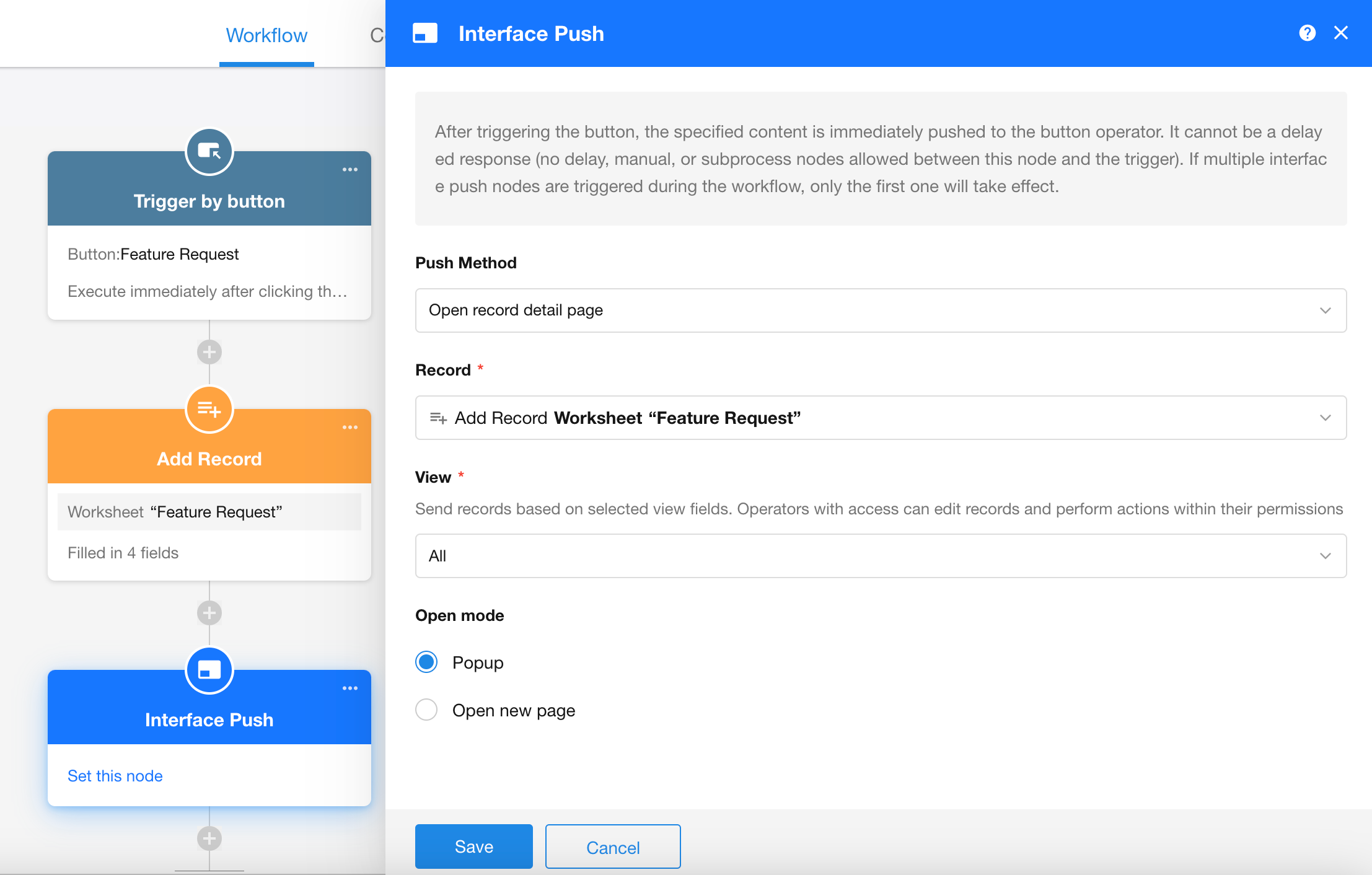 From workflow triggering to the Interface Push node, execution must be instantaneous. Therefore, between the trigger node and Interface Push node, the following 5 types of nodes that may require waiting cannot appear: Approval, Fill-in, Delay, Sub-process, PBP, Loop.