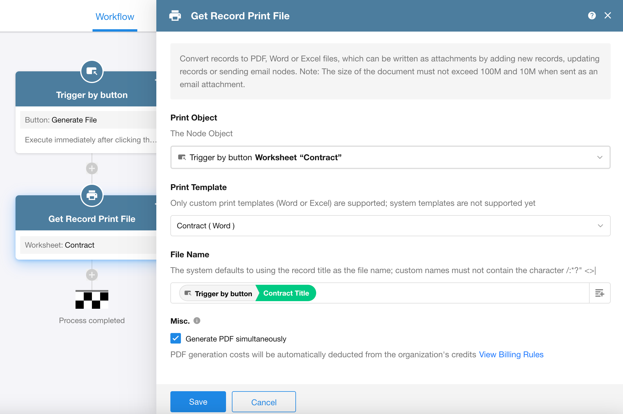 This node allows users to automatically generate a Word or Excel file (free) or a PDF file (paid) based on a selected template and record content. The generated file can be written into an attachment field or used as an attachment in a "Send Email" node.