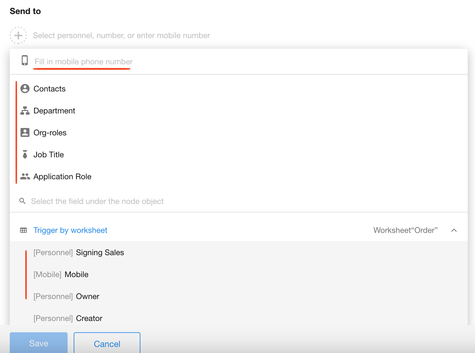 Add recipients by department, organizational role, or application role (all members under selected roles will receive SMS)