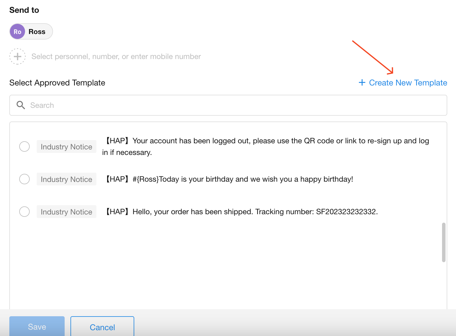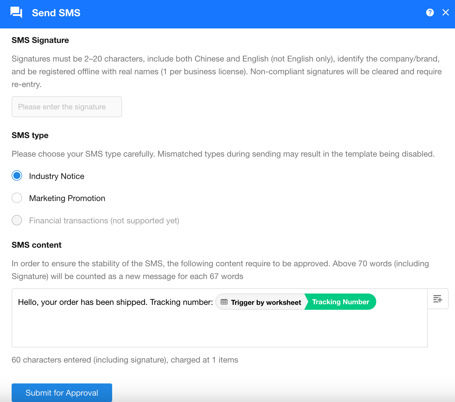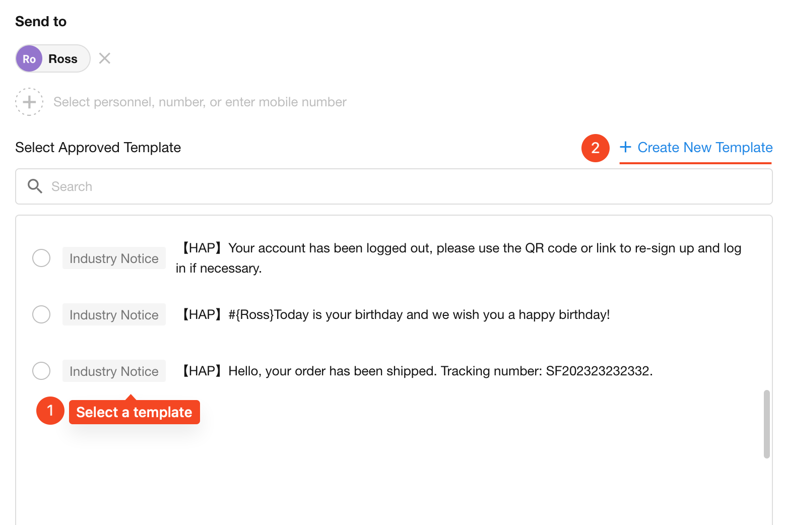 According to regulations from the Cyberspace Administration of China, SMS templates must be approved before use. Users can create new templates or select pre-approved templates.