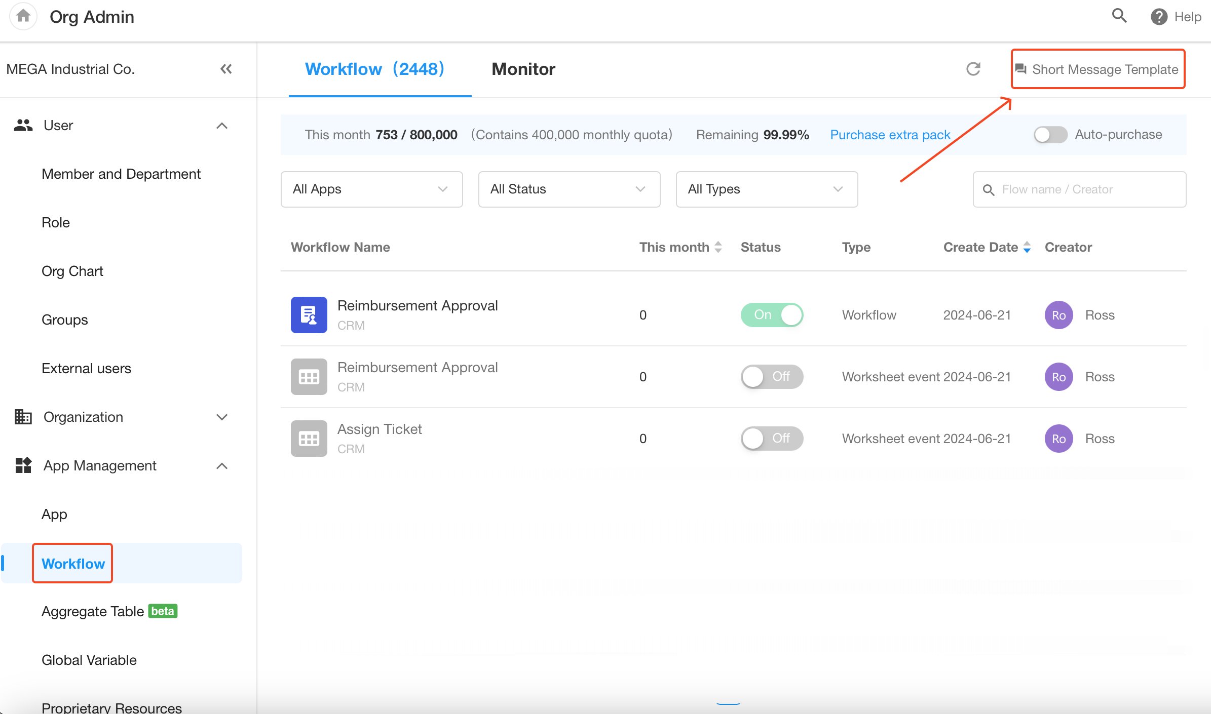 - App admins in organization can also view status by clicking "Short Message Templates" in workflow management page.