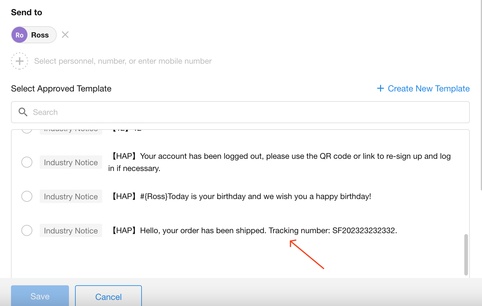 Click to select an SMS template from the template list.
