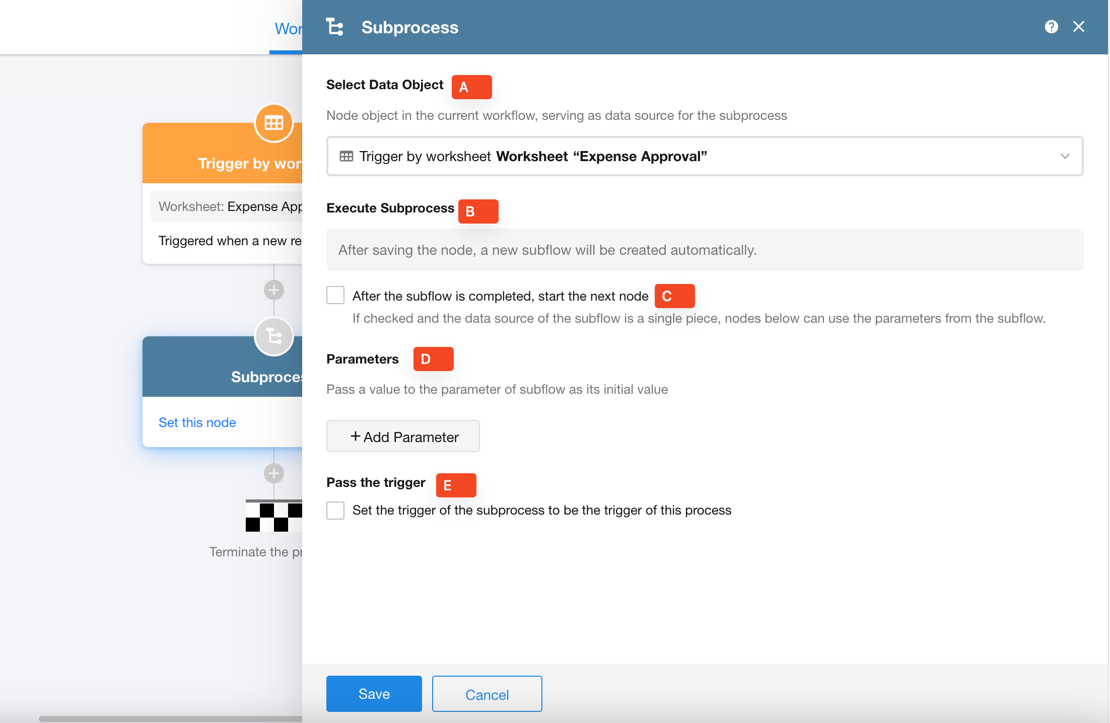 E. Pass the trigger: If "Set the trigger of the subprocess to be the trigger of this process" is checked, the subprocess will inherit the trigger identity. Otherwise, the subprocess will be triggered by the system workflow engine.