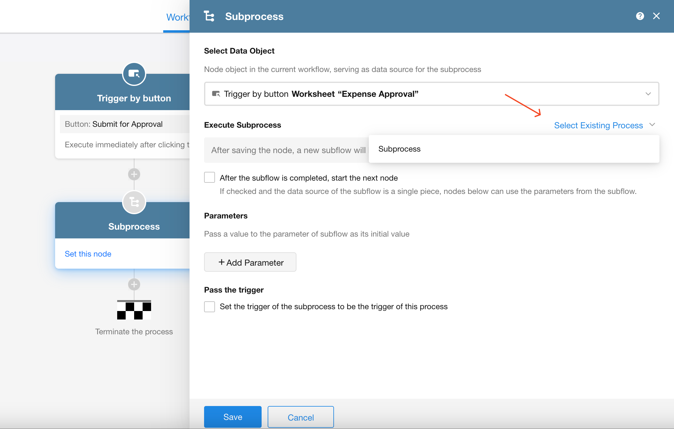 In workflows triggered by a custom button, you can directly add a subprocess node and select an existing subprocess to reuse.