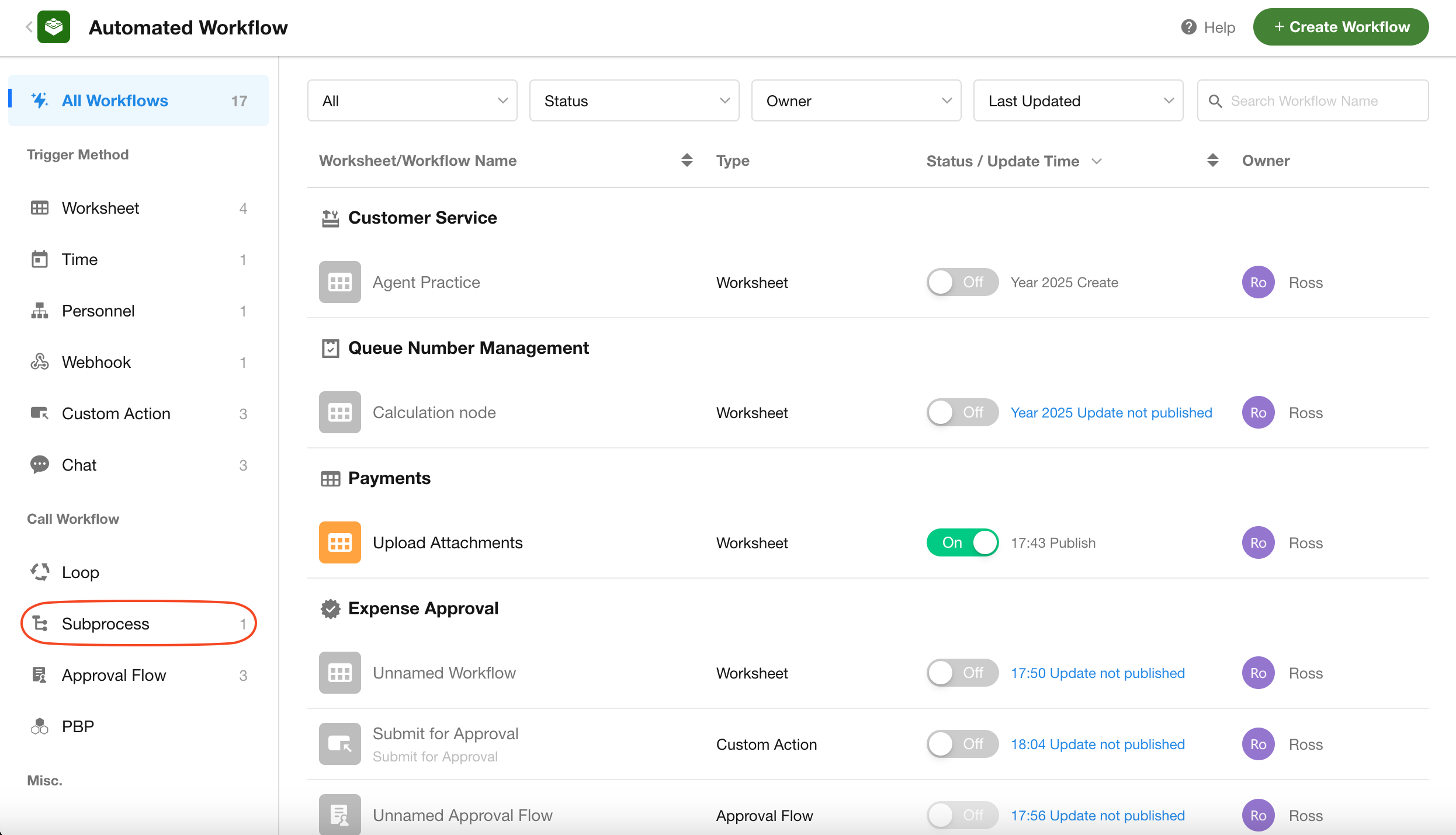 When selecting a subprocess, only workflows of type "subprocess" are available. Workflows triggered by worksheet events, date fields, schedule timers, Webhooks, or buttons cannot be selected.