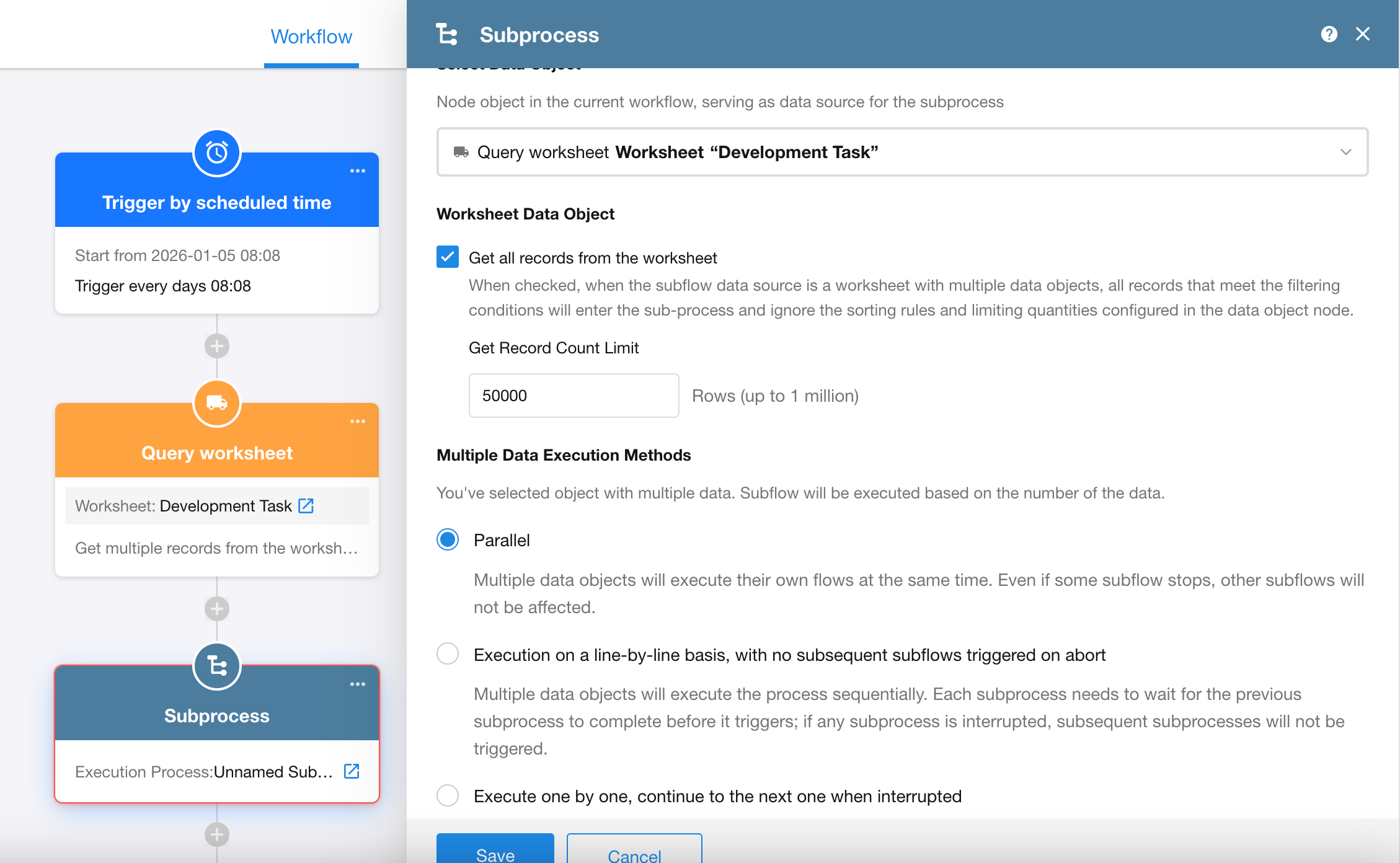 When your workflow needs to process over 100 worksheet records in one batch, subprocesses can help. A single subprocess can handle up to 1 million worksheet records efficiently.