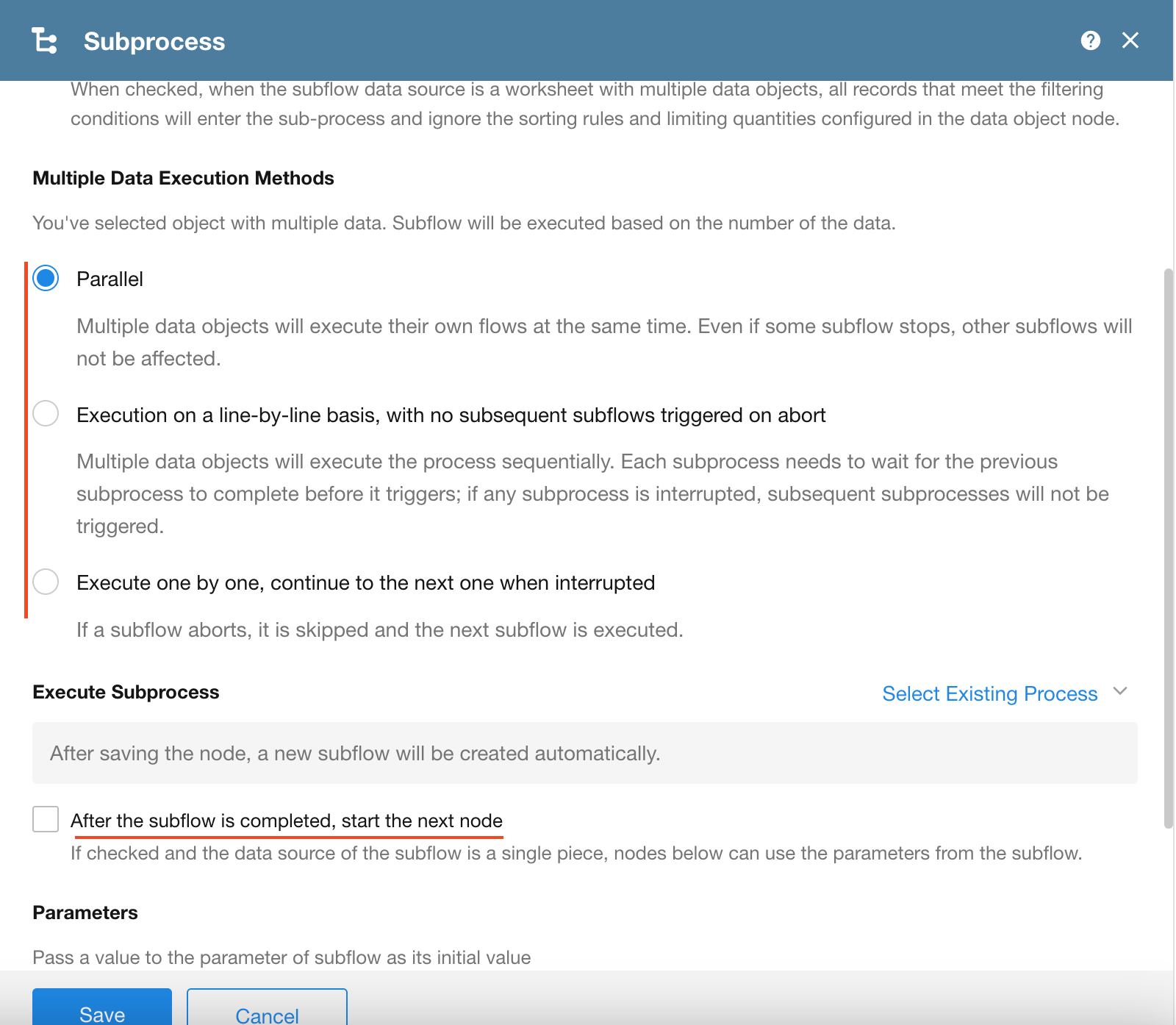 If "After the subprocess is completed, start the next node" is not checked, the outcome of the subprocess will not affect the rest of the main workflow.