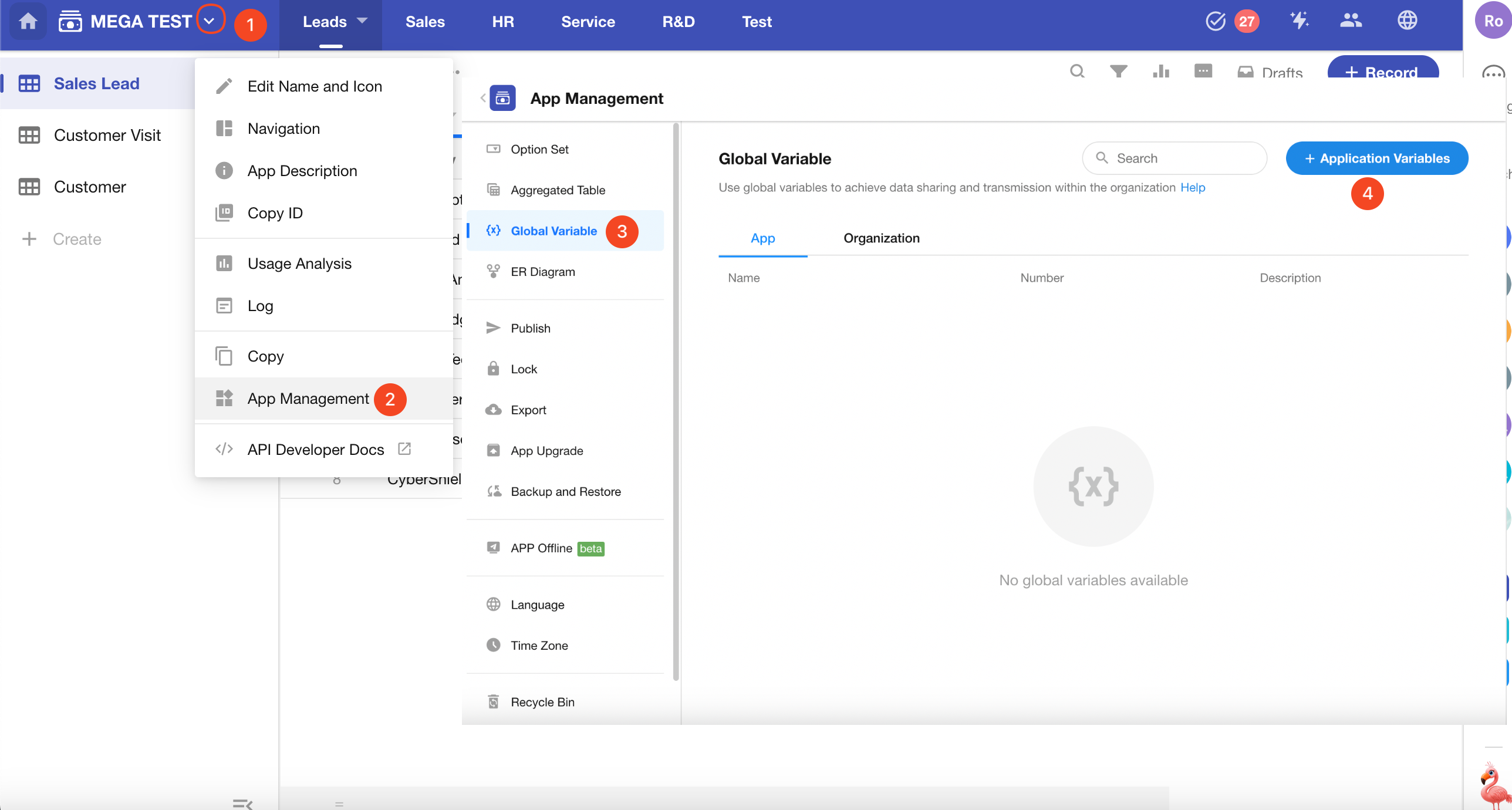 Application administrators or developers can navigate to [App Management] > [Global Variables] to add variables. Variables added here are application-level and only available within the current application.