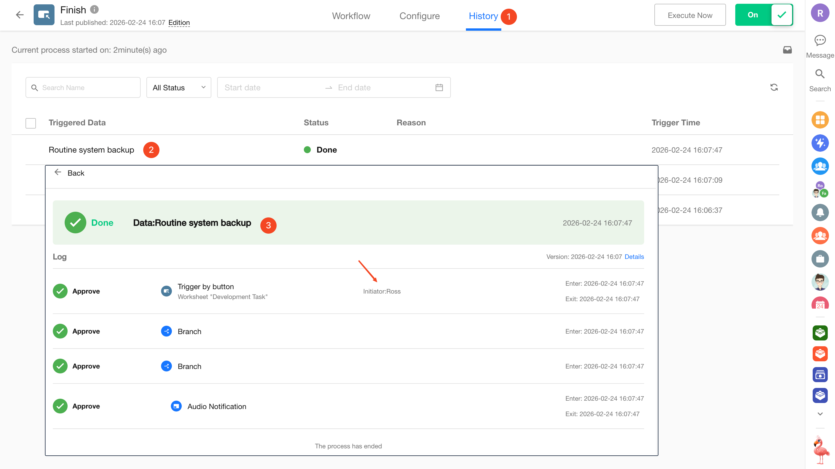 If a button-triggered workflow calls an packaged business process, the Audio Notification node inside the packaged business process will not play, because the trigger initiator is “Workflow.”To enable playback, place the Audio Notification node directly inside the button-triggered workflow.
