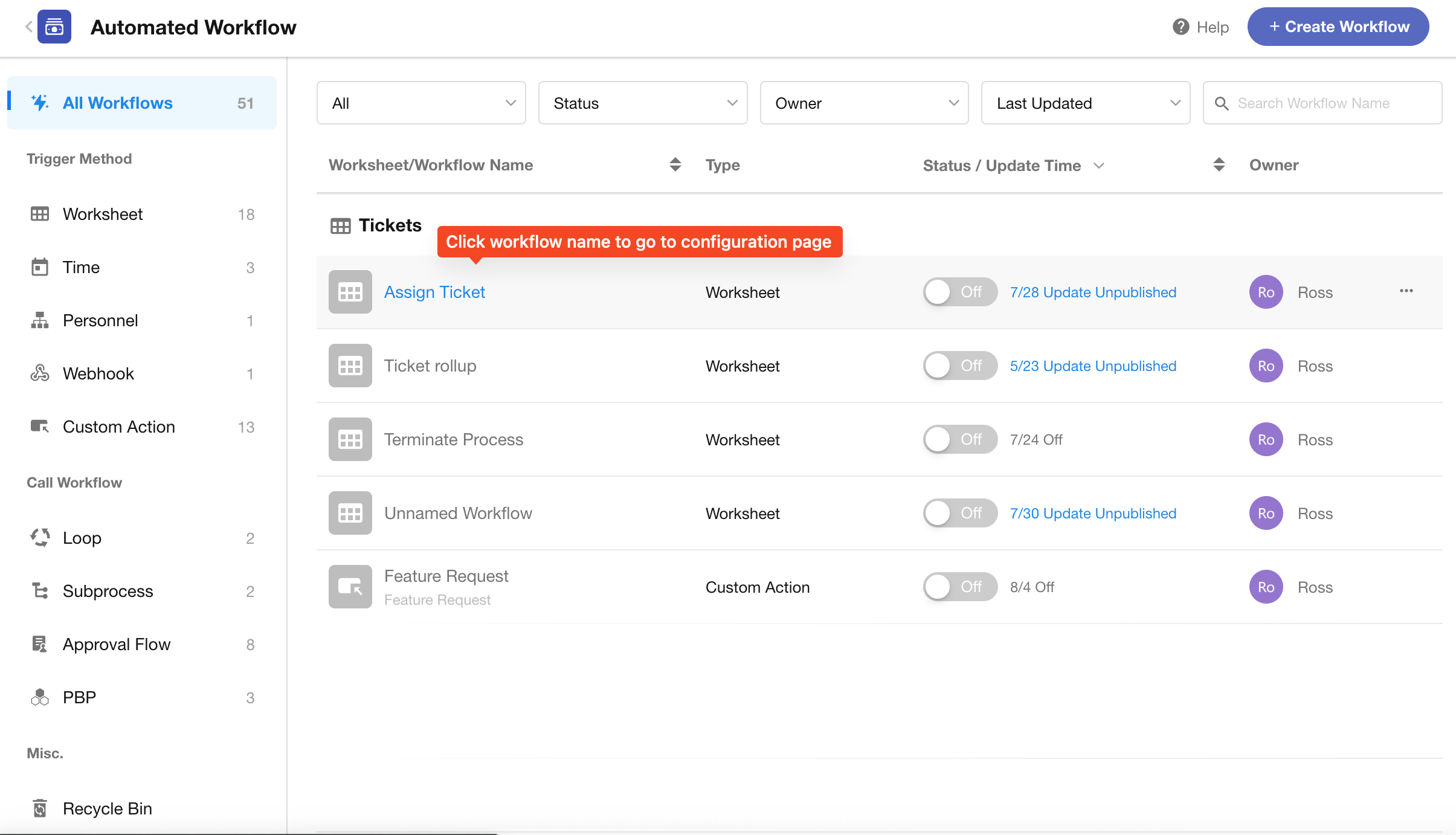 In an application, find the workflow you want to modify and click its name to enter the workflow configuration page.
