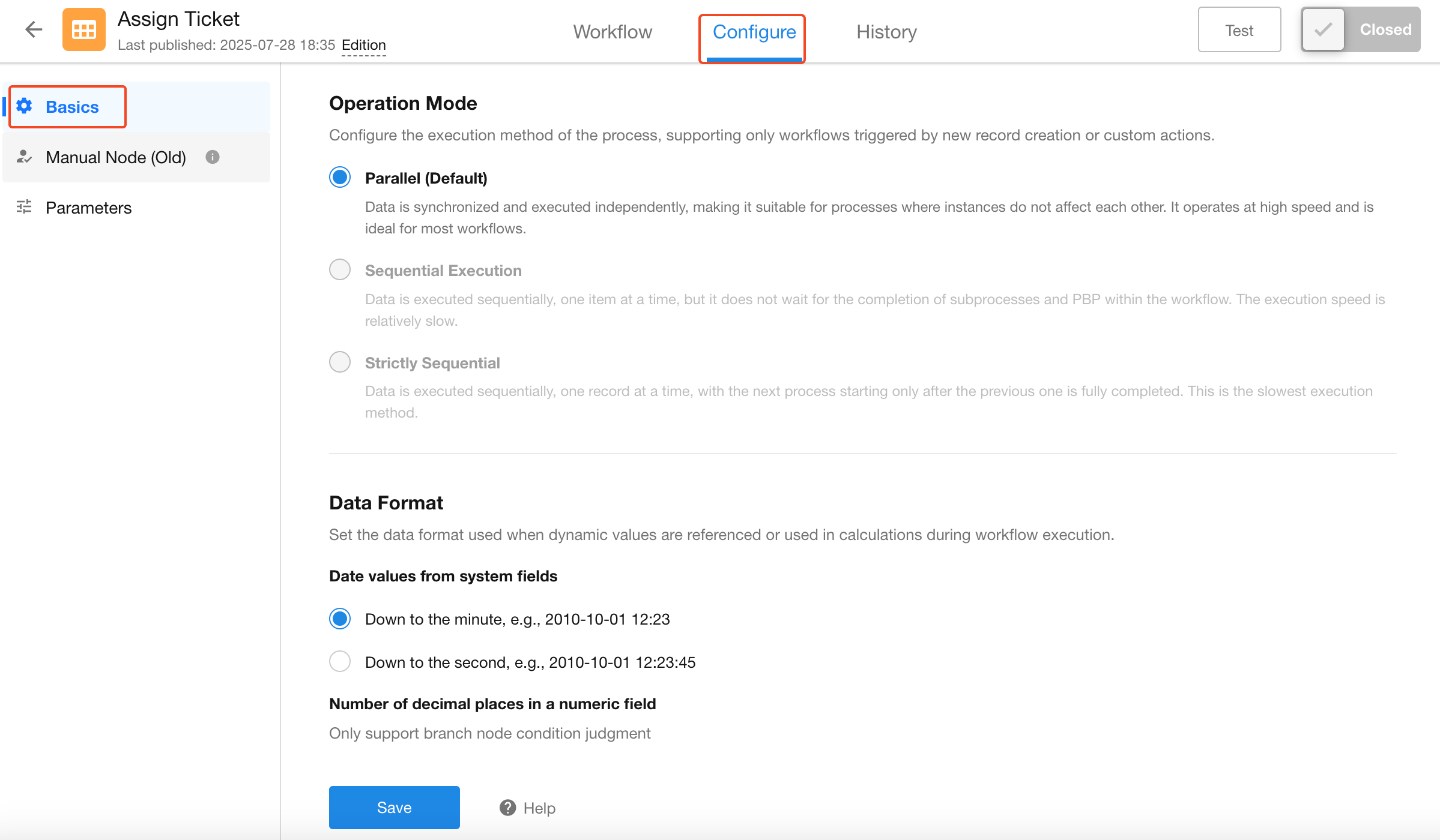 Configure the workflow’s execution settings, automatic approval for approval nodes, etc. More details