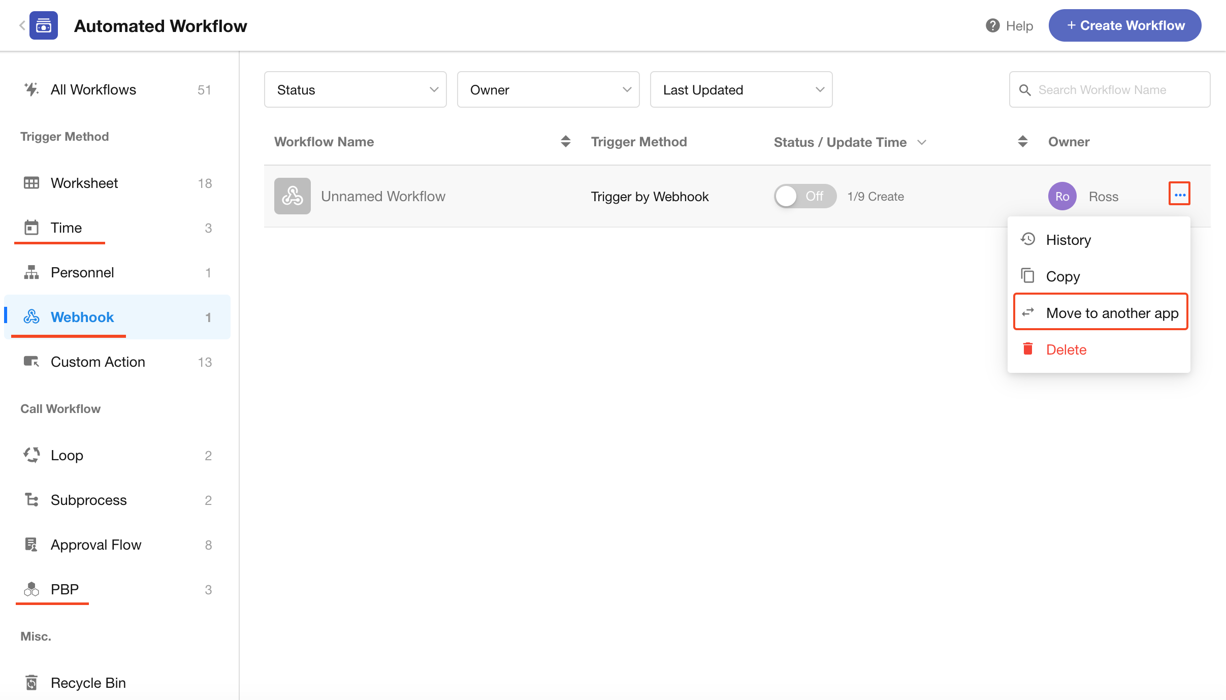 Workflows that are not triggered by worksheet data can be moved to other applications. The following workflow types can be moved: