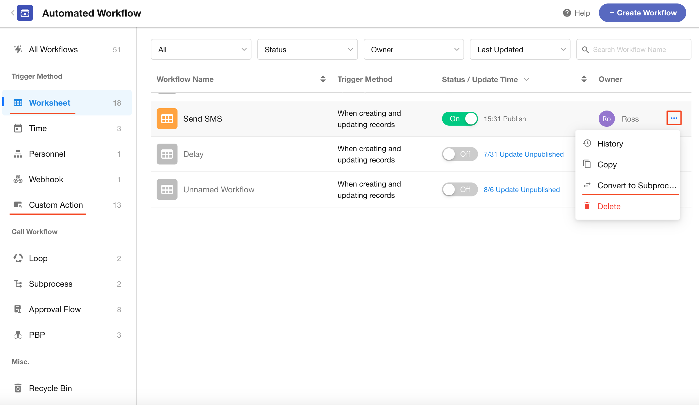 Workflows triggered by worksheet events, custom buttons, or date fields can be converted to subprocesses.