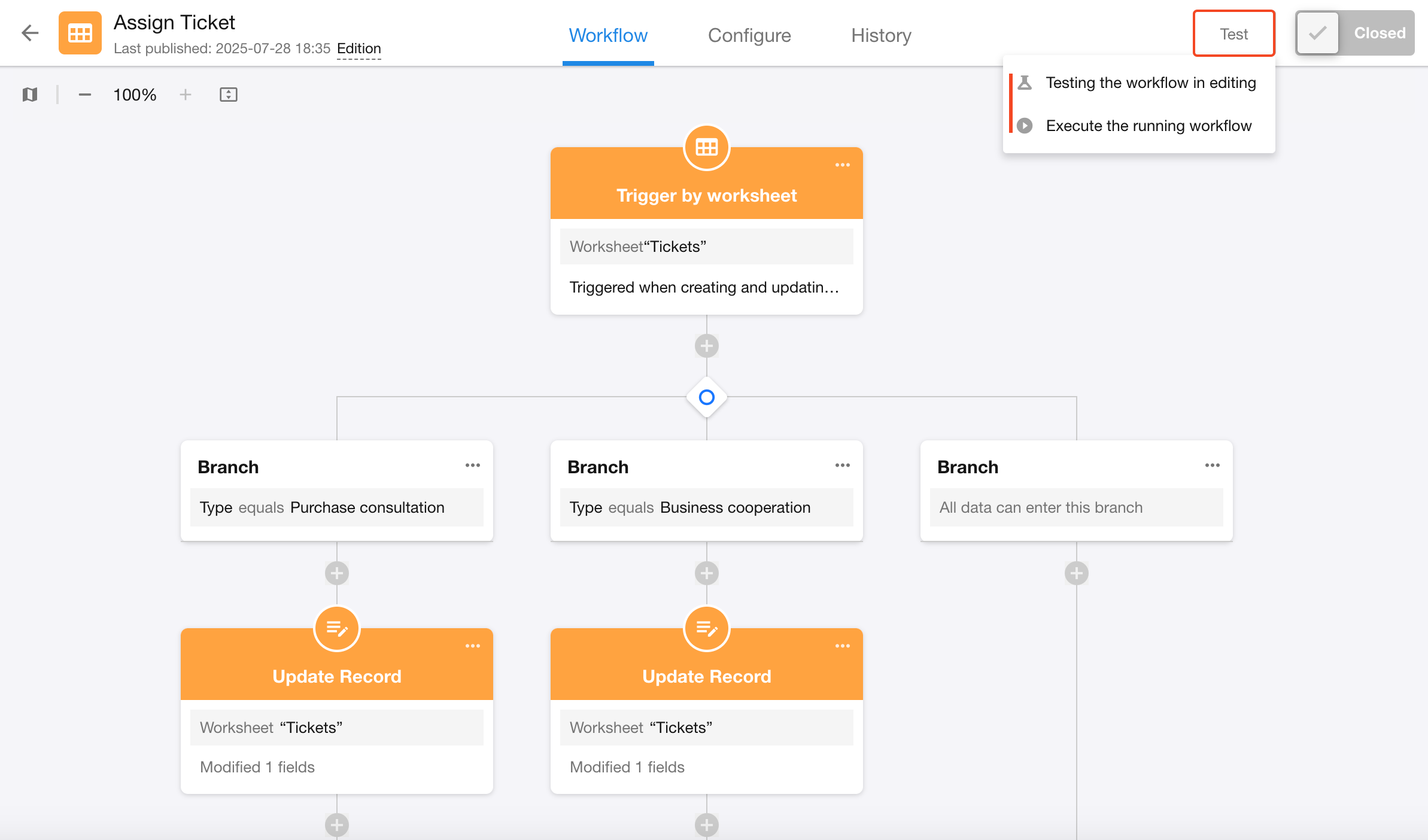After designing and configuring a workflow, it’s important to test its execution effects. You can test both published workflows that are currently running and workflows that are in editing and not yet published.