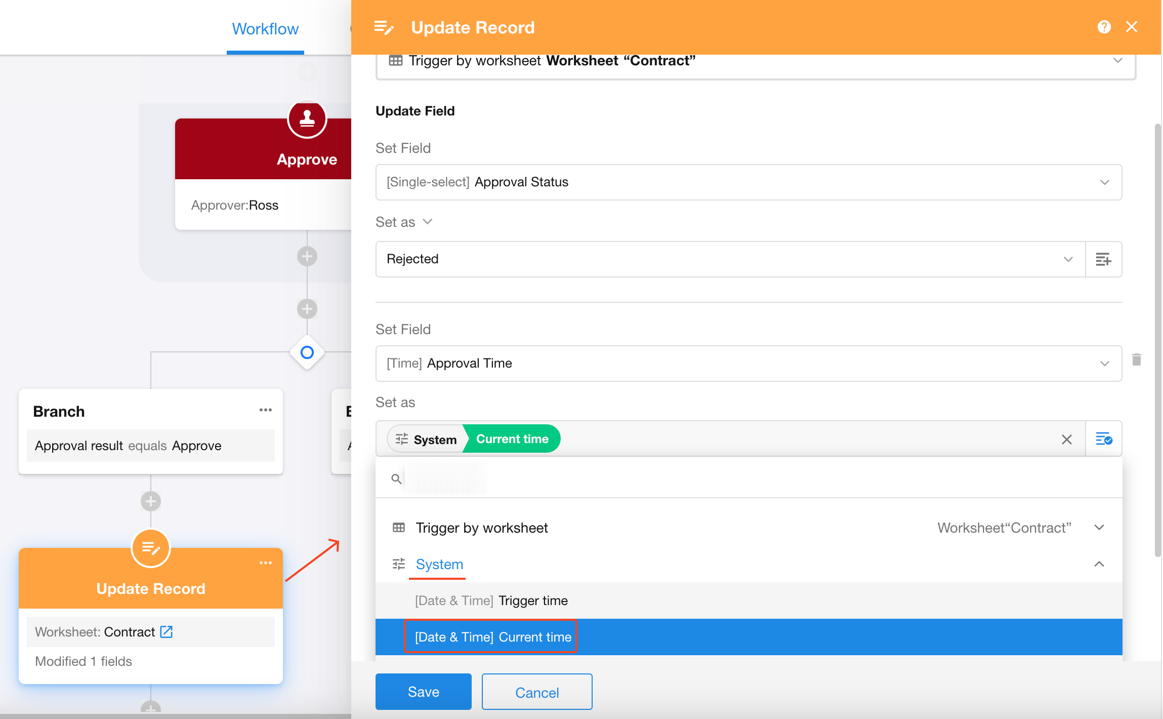 Whenever a contract record is added or updated in a worksheet, an approval workflow is triggered. Once the contract is approved, the approval time should be automatically written back into the record.