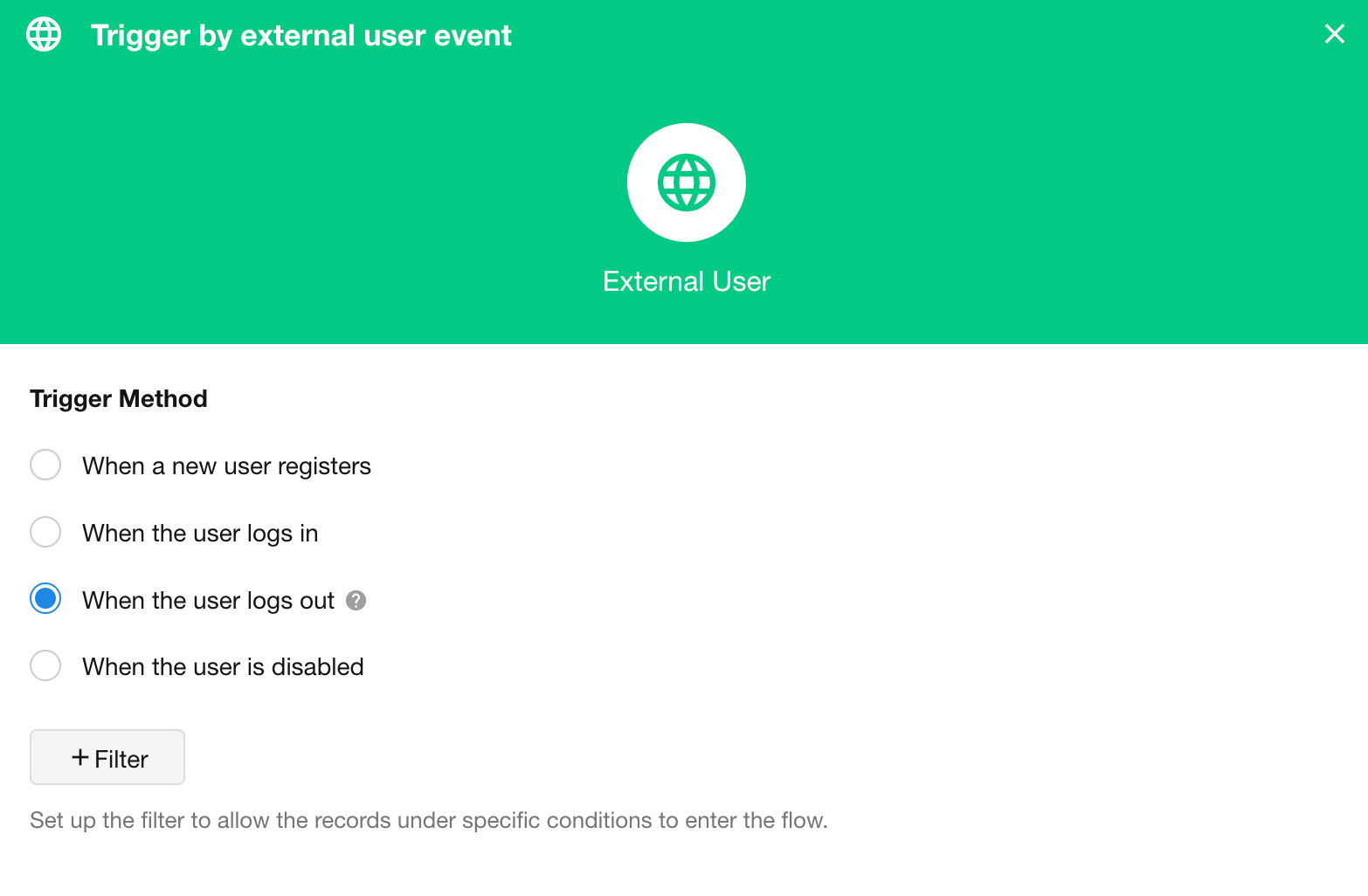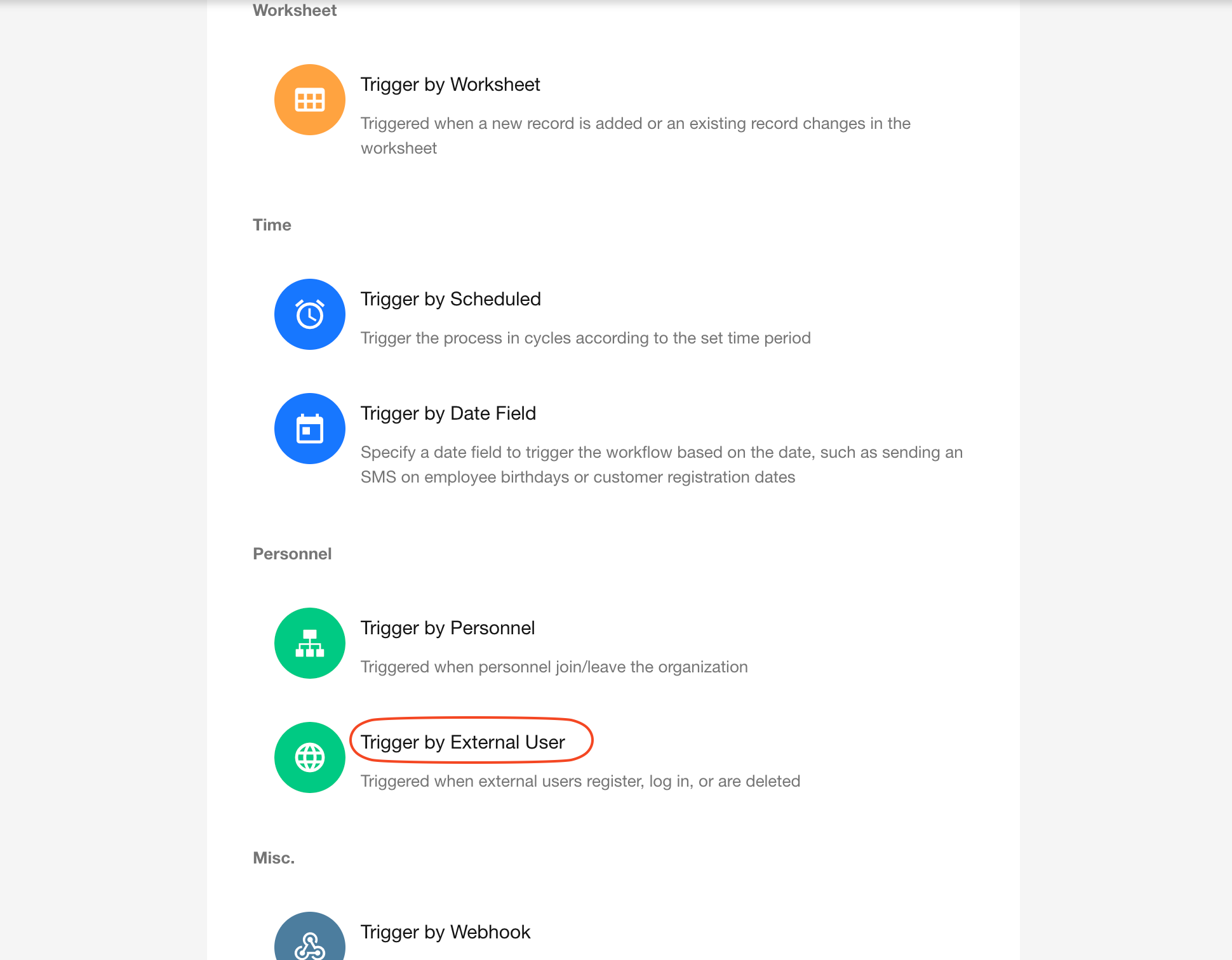 Similar to workflows triggered by organization personnel, when external users of the application register, log in (including automatic login), log out, or are deactivated, a workflow can be triggered to execute planned action nodes.