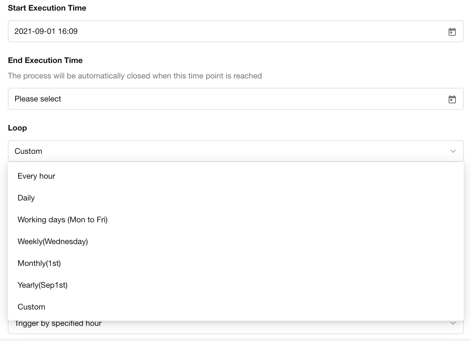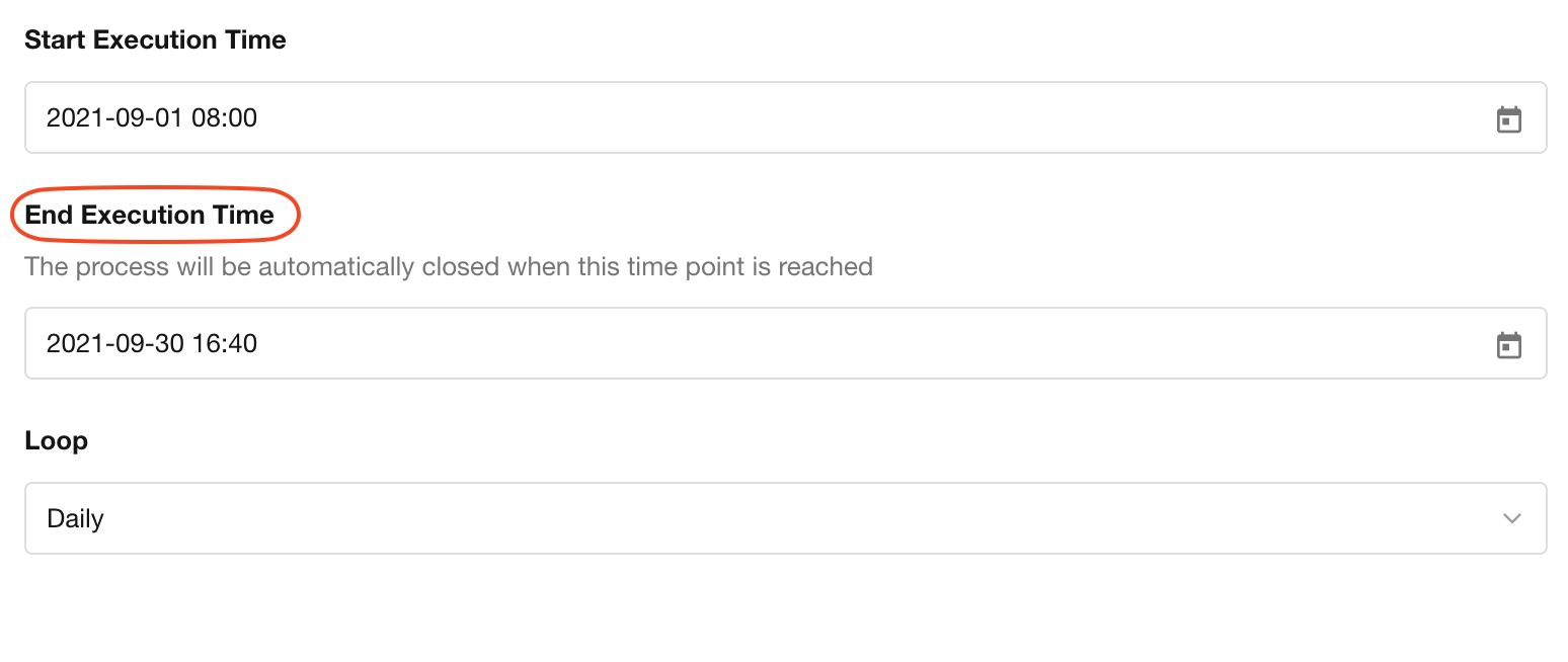 If the workflow should not run indefinitely, specify an end time. The workflow will automatically terminate when this time is reached.