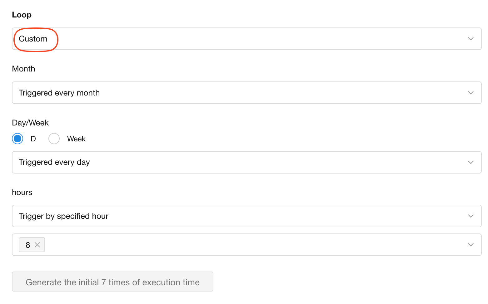 Users can set a recurring time cycle (e.g., every Monday at 8:00 AM) - the workflow will automatically trigger at each scheduled time.