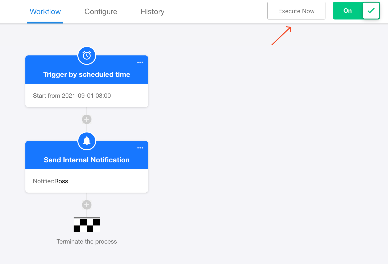 After publishing the workflow, click [Execute now] to test the workflow.