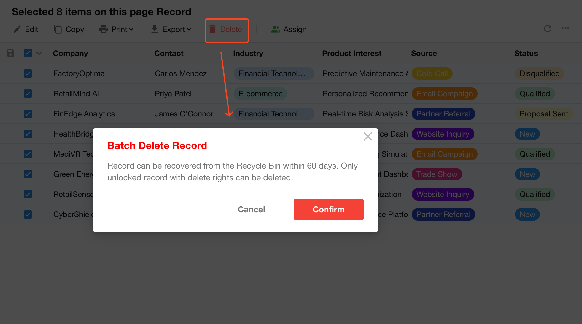 Can delete up to 1000 records per operation. If more are selected, only the first 1000 will be deleted. Deleted records are moved to the Recycle Bin and can be restored.