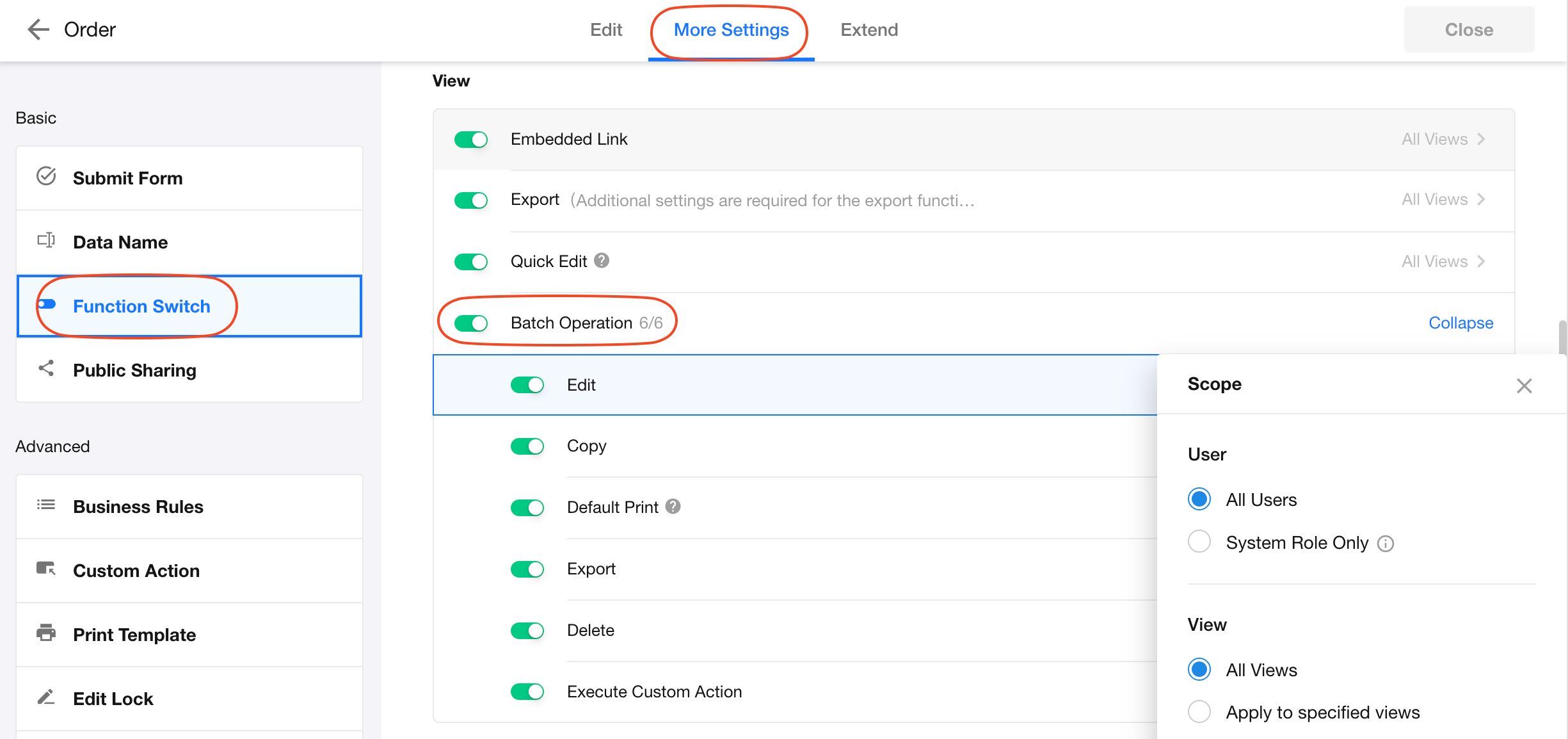 The application administrator must first enable Batch Operation (define user scope and view scope).