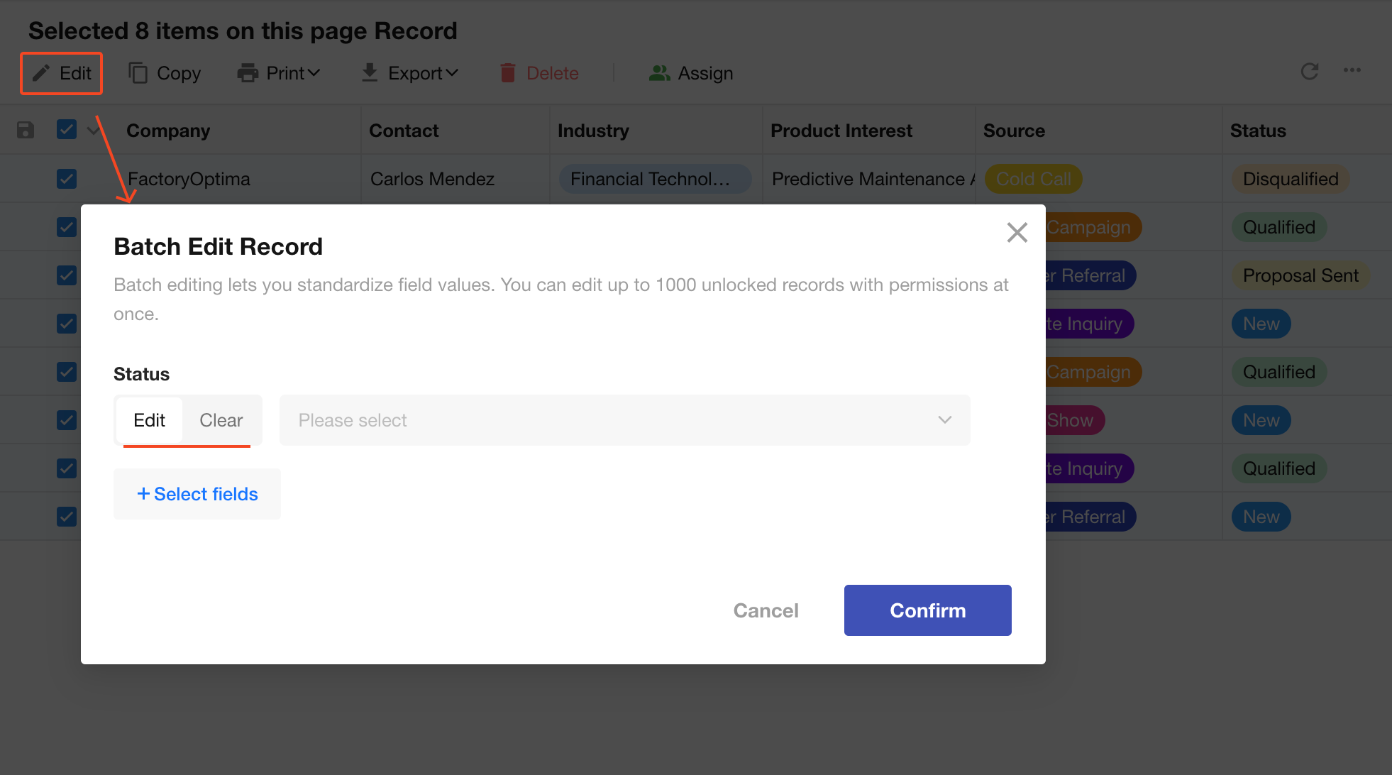 Supports editing multiple fields at once. Read-only fields cannot be edited.