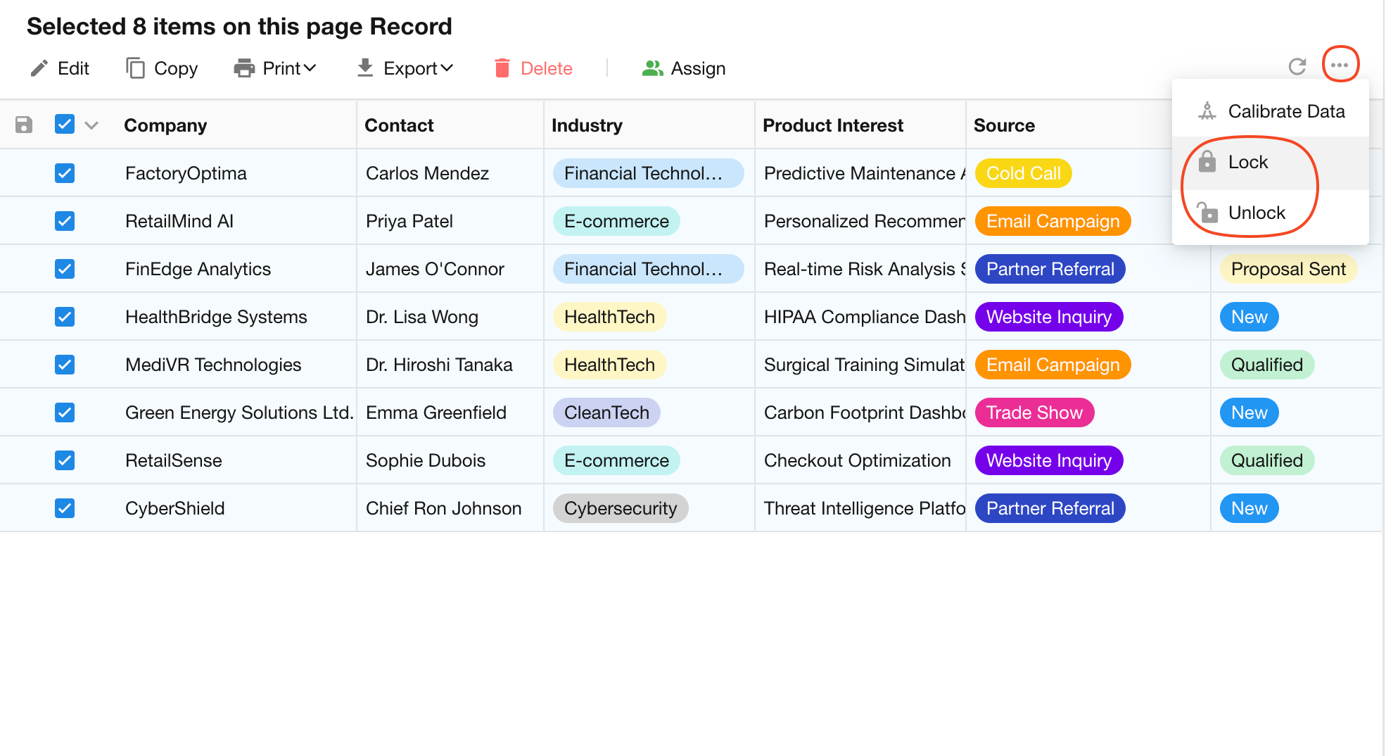 Records in a worksheet support bulk operations such as updating field values, copying records, exporting data to Excel, exporting attachments, deleting records, printing QR codes, refreshing data, locking/unlocking records, and more.