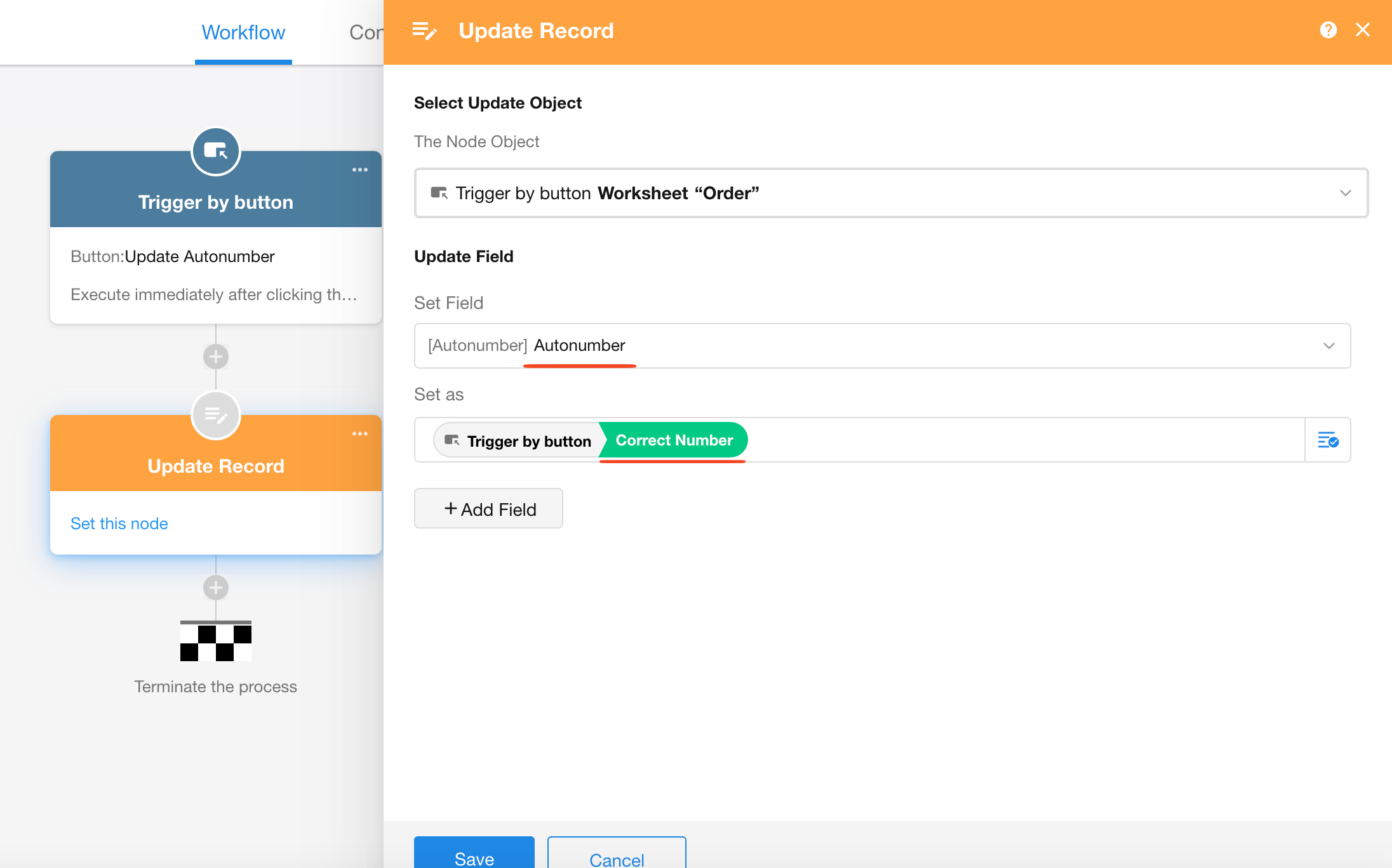 Add an "Update Record" node to set the "Autonumber" as "Correct Number".