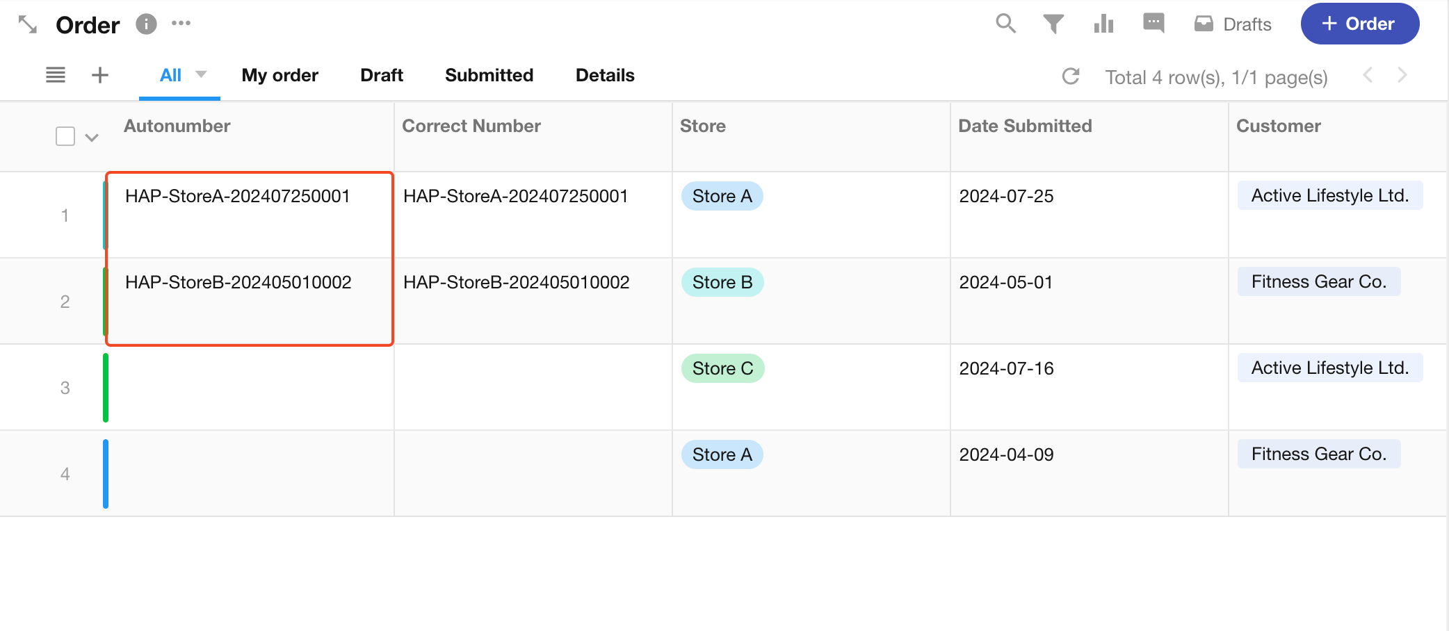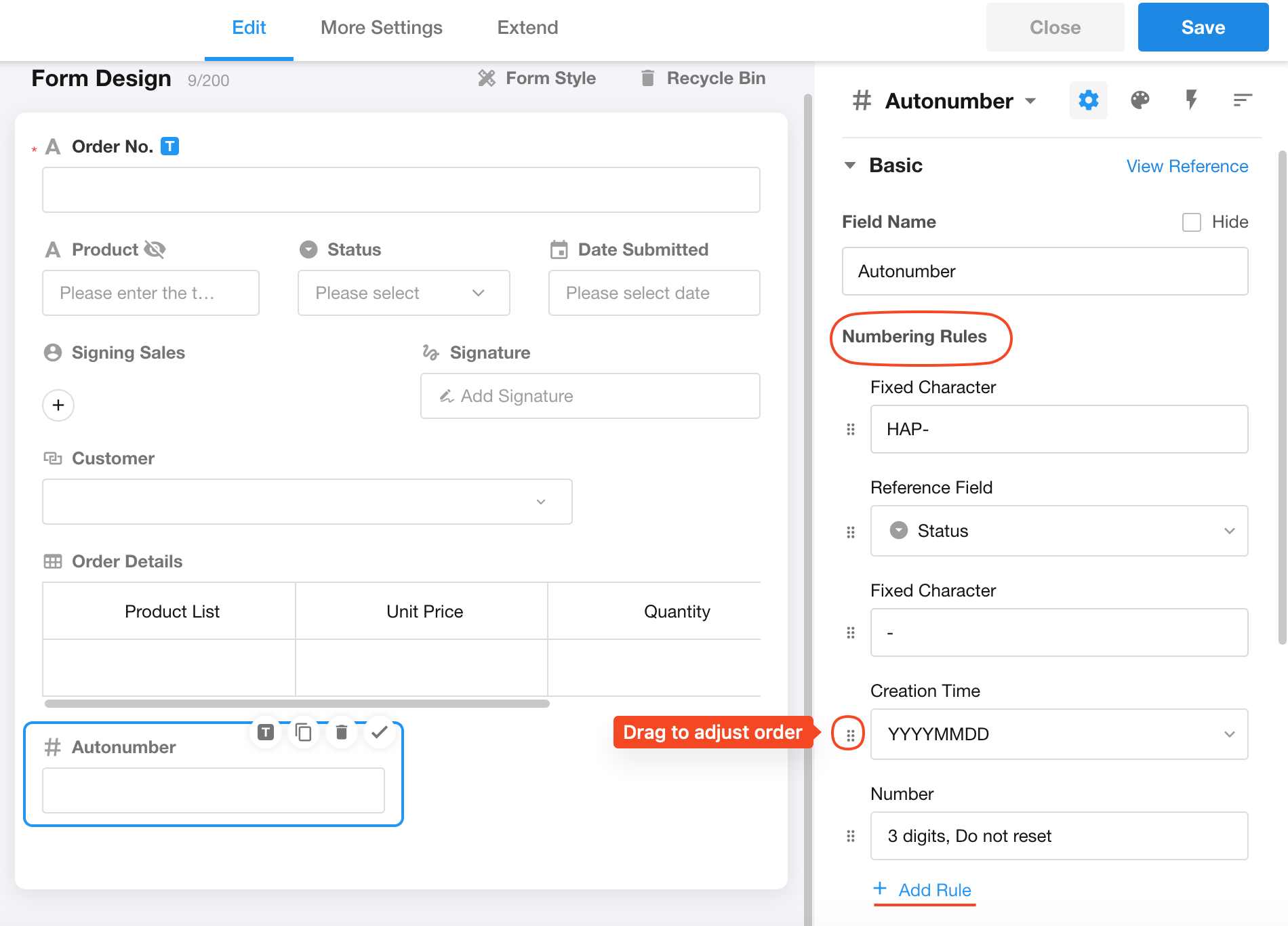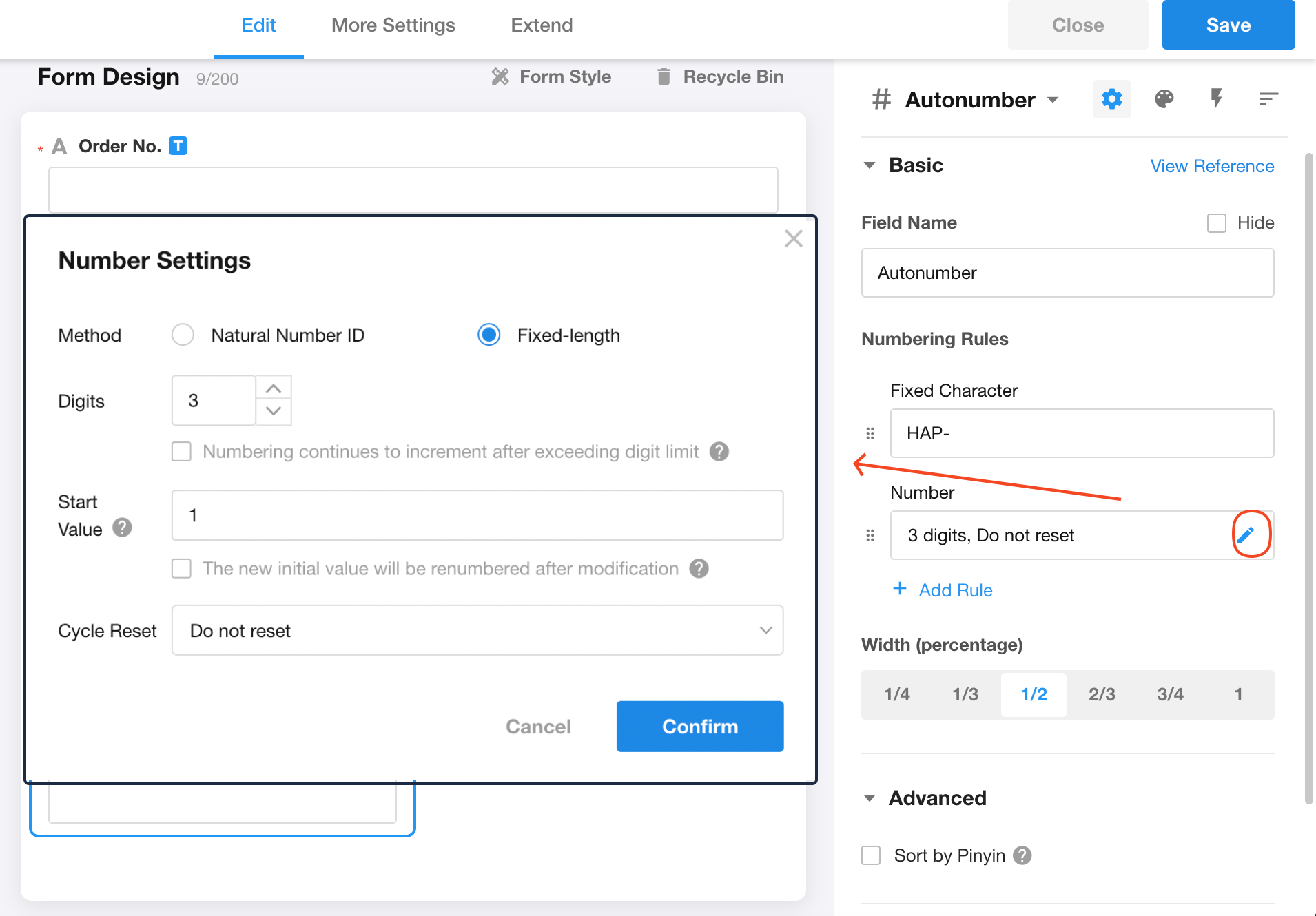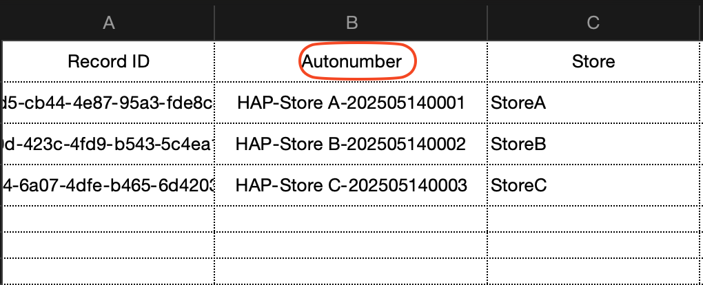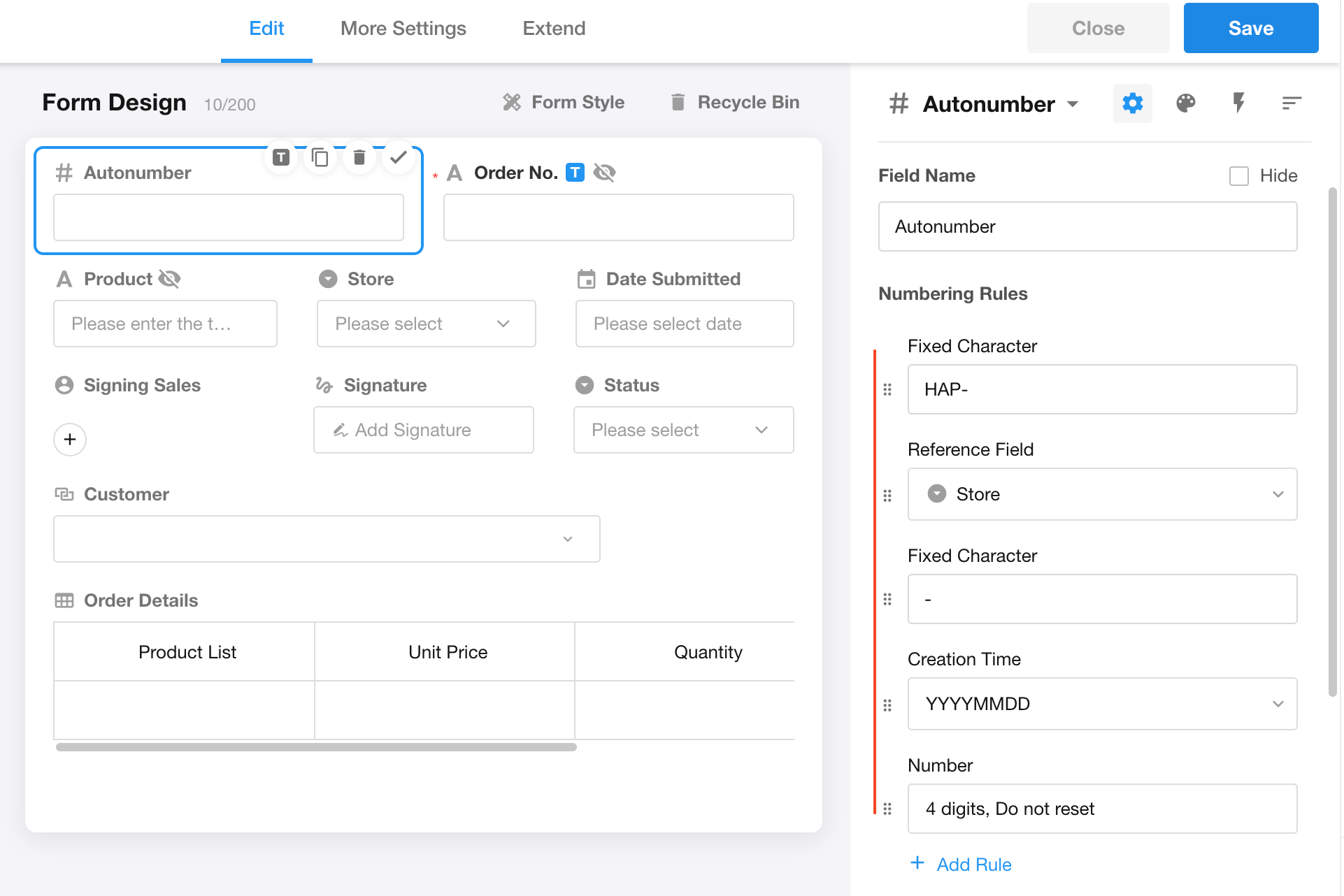 For example, to configure the numbering format HAP-Store A-202505140003, the rules would be set up as follows: