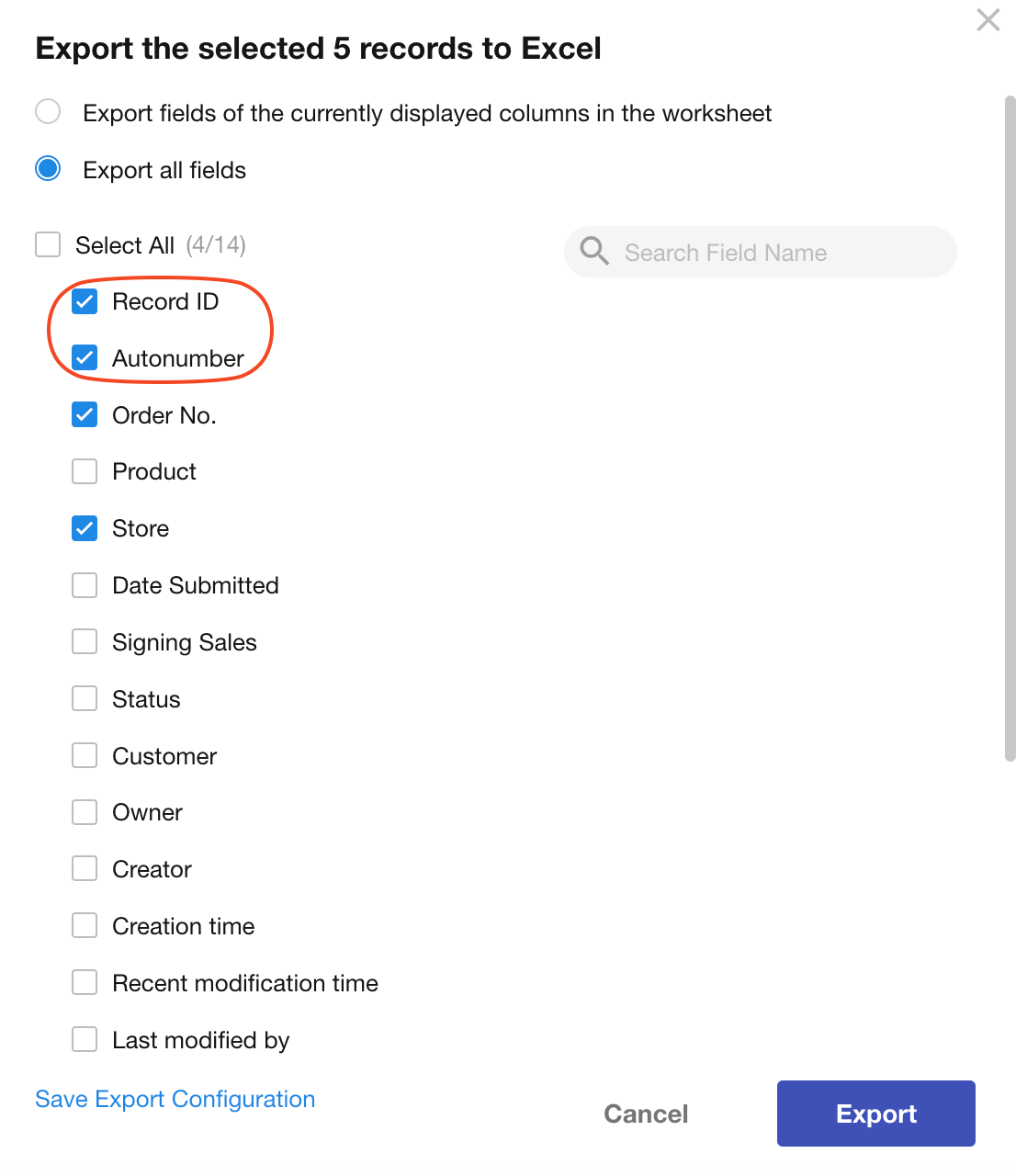 Export worksheet data, including only: the "Autonumber" field, "Record ID" field, and one additional identifier field (to distinguish records).