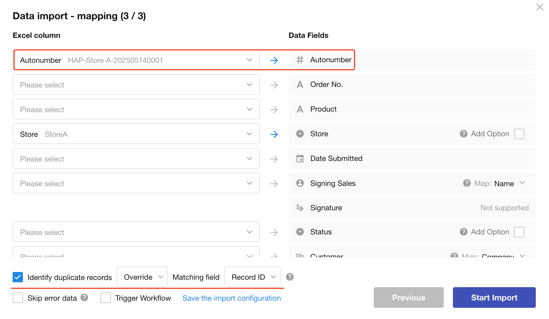 Edit the exported Excel file: Correct the auto-numbers for each record. Do not modify other columns.