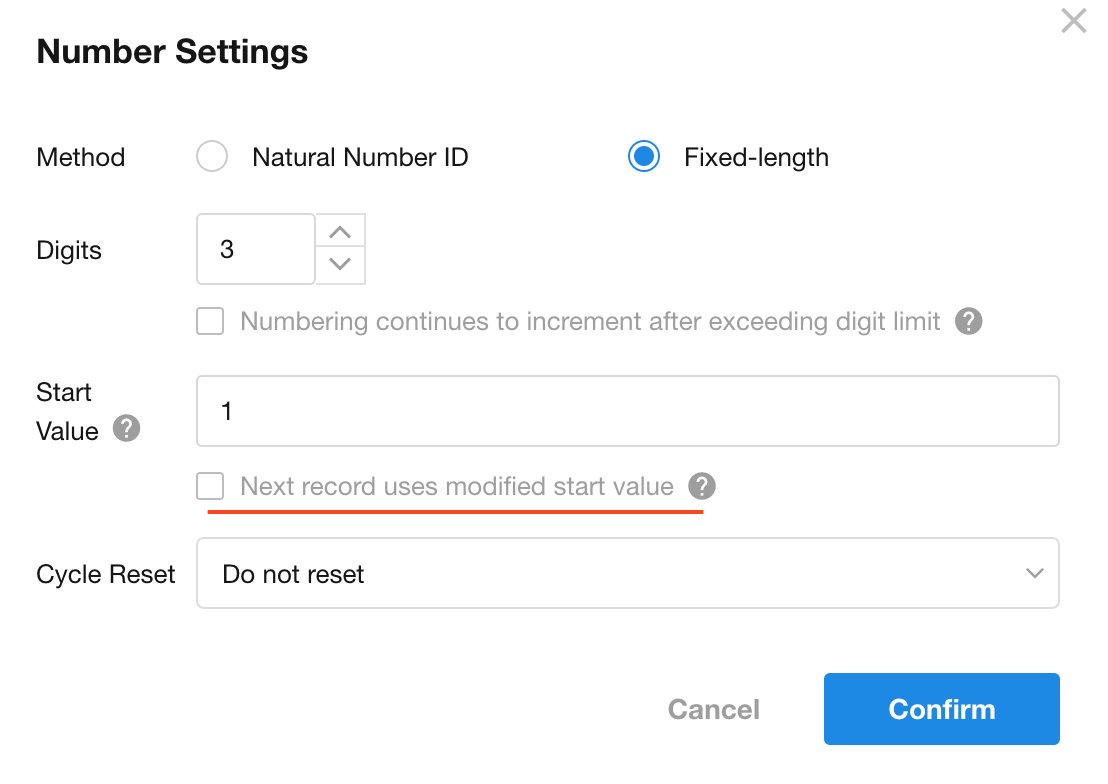 "Next record uses modified start value": if checked, newly created records adopt the manually set start value, ignoring prior counts.
