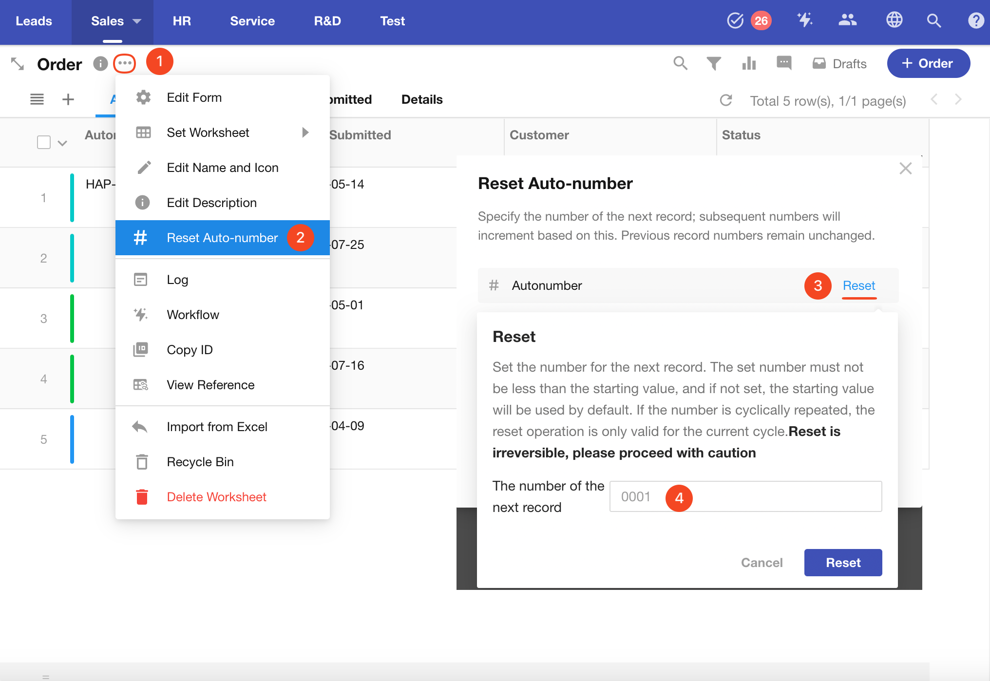 Click the "three-dot" button next to the worksheet name, then select "Reset autonumber".