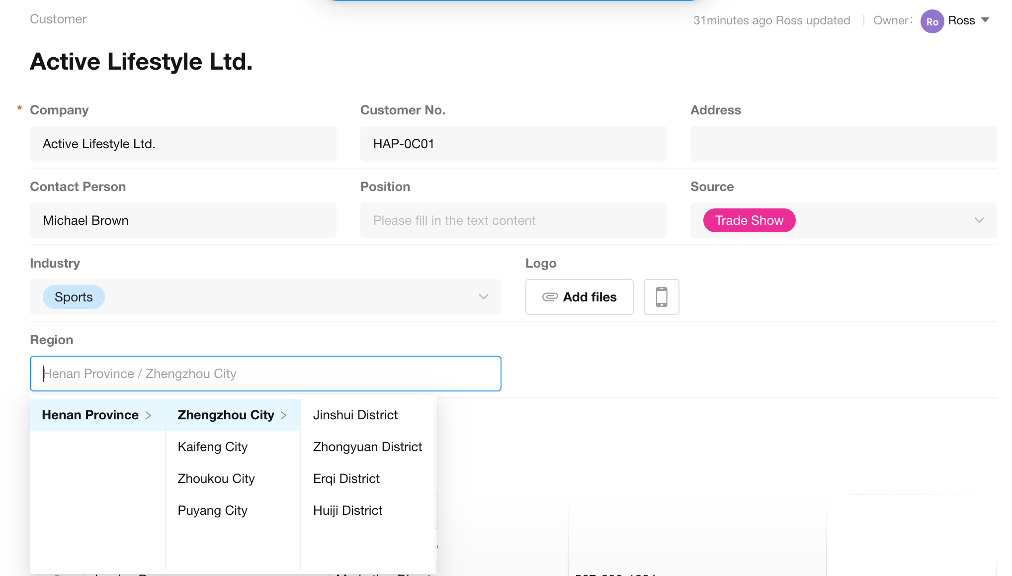 In the customer worksheet, displaying the customer's region facilitates statistical analysis by area.