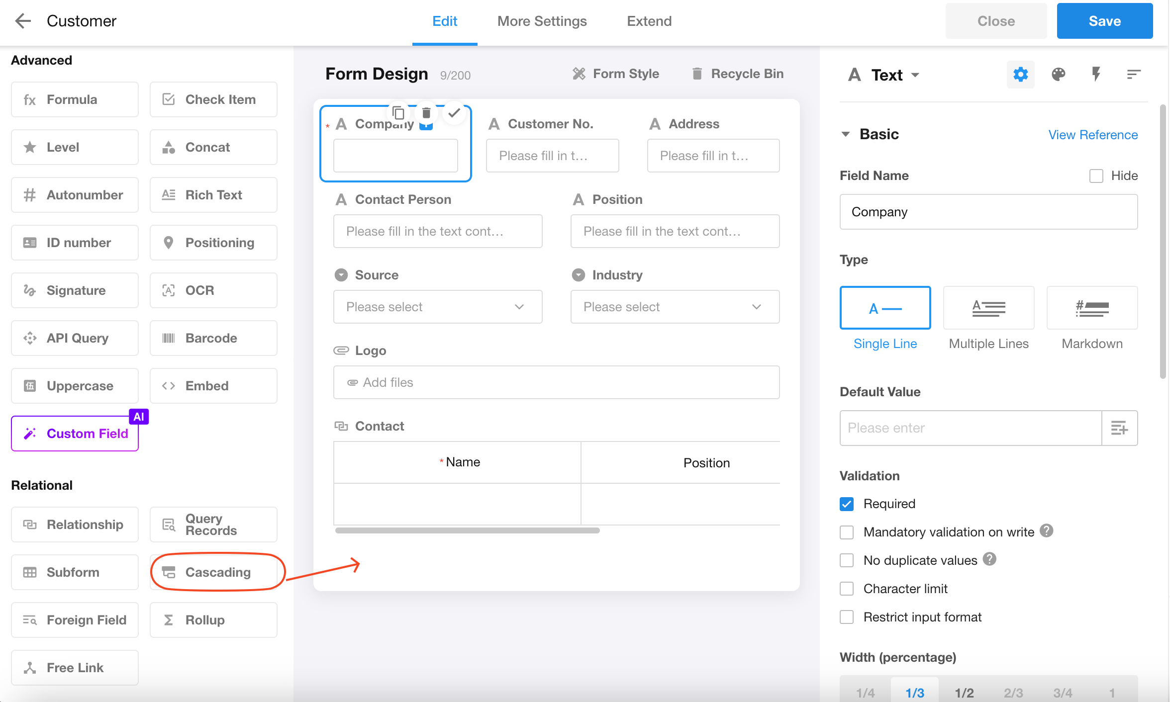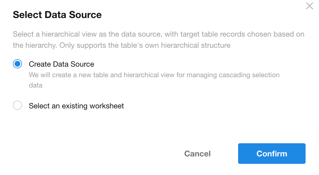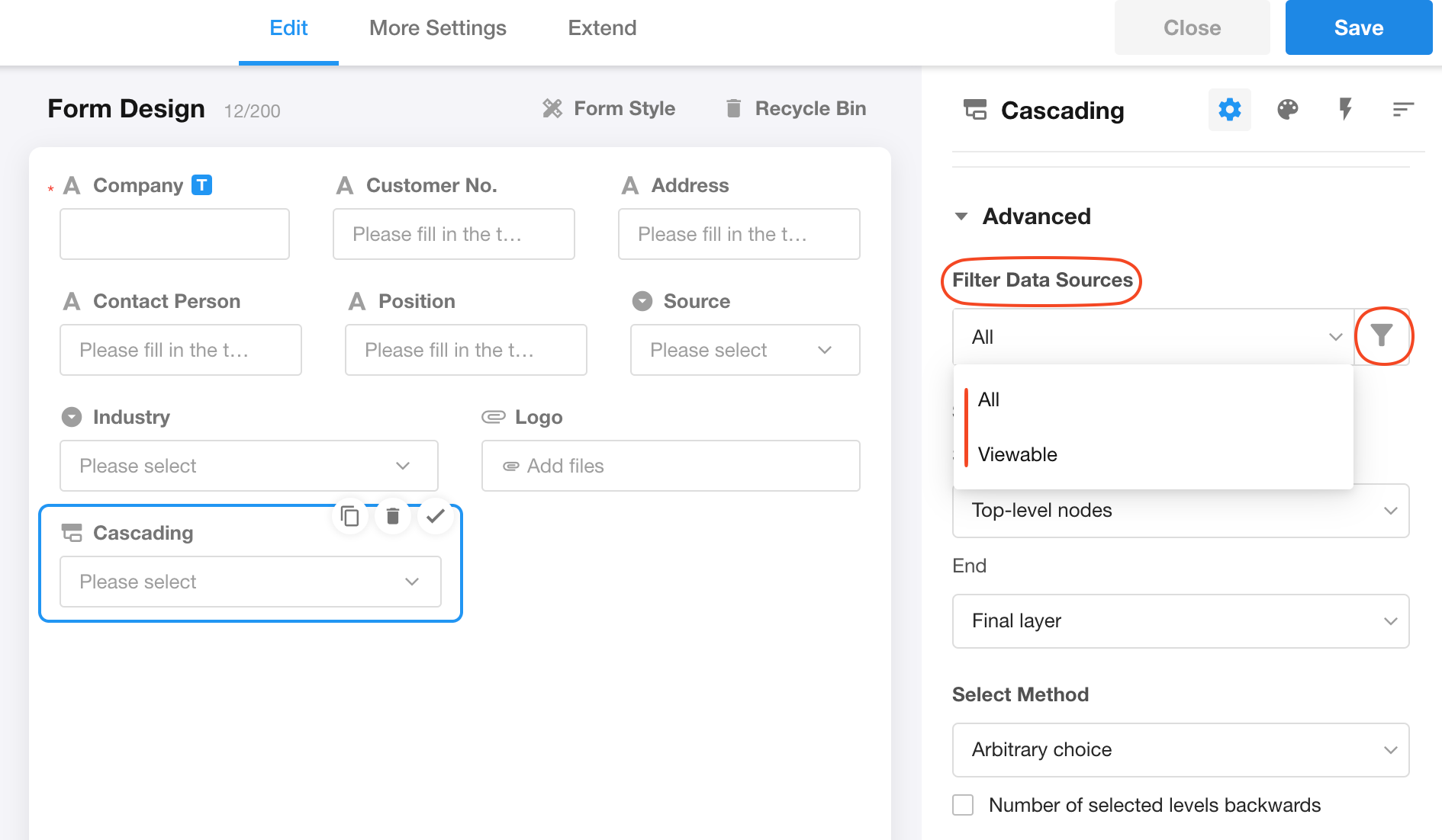 The Cascading field provides flexible configuration options for displaying data items to meet various requirements. It primarily offers three data display modes: All Data, Data Accessible to Users, and Data Matching Filter Conditions.