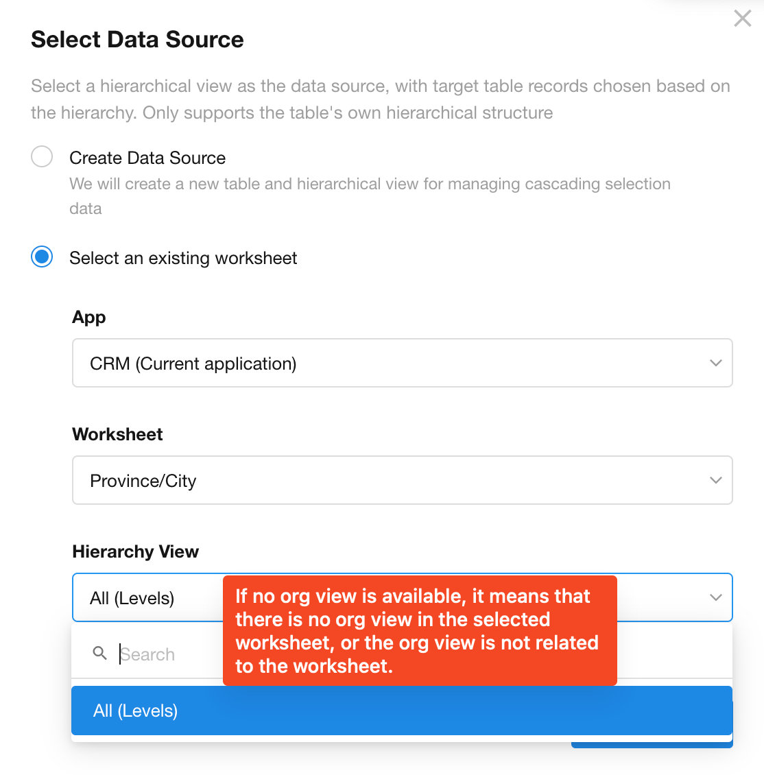 The Cascading control requires a configured data source. Essentially, its data source is a worksheet containing an org view, meaning the current worksheet is related to the data source worksheet.