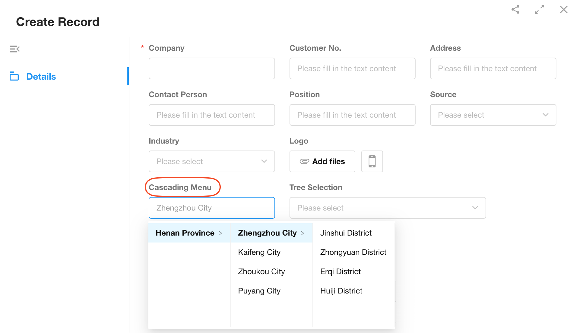 When enabled, the Cascading field will display the full hierarchical path (e.g., "Henan Province/Zhengzhou City/Jinshui District"). When disabled, only the final level's content will be shown (e.g., "Jinshui District").