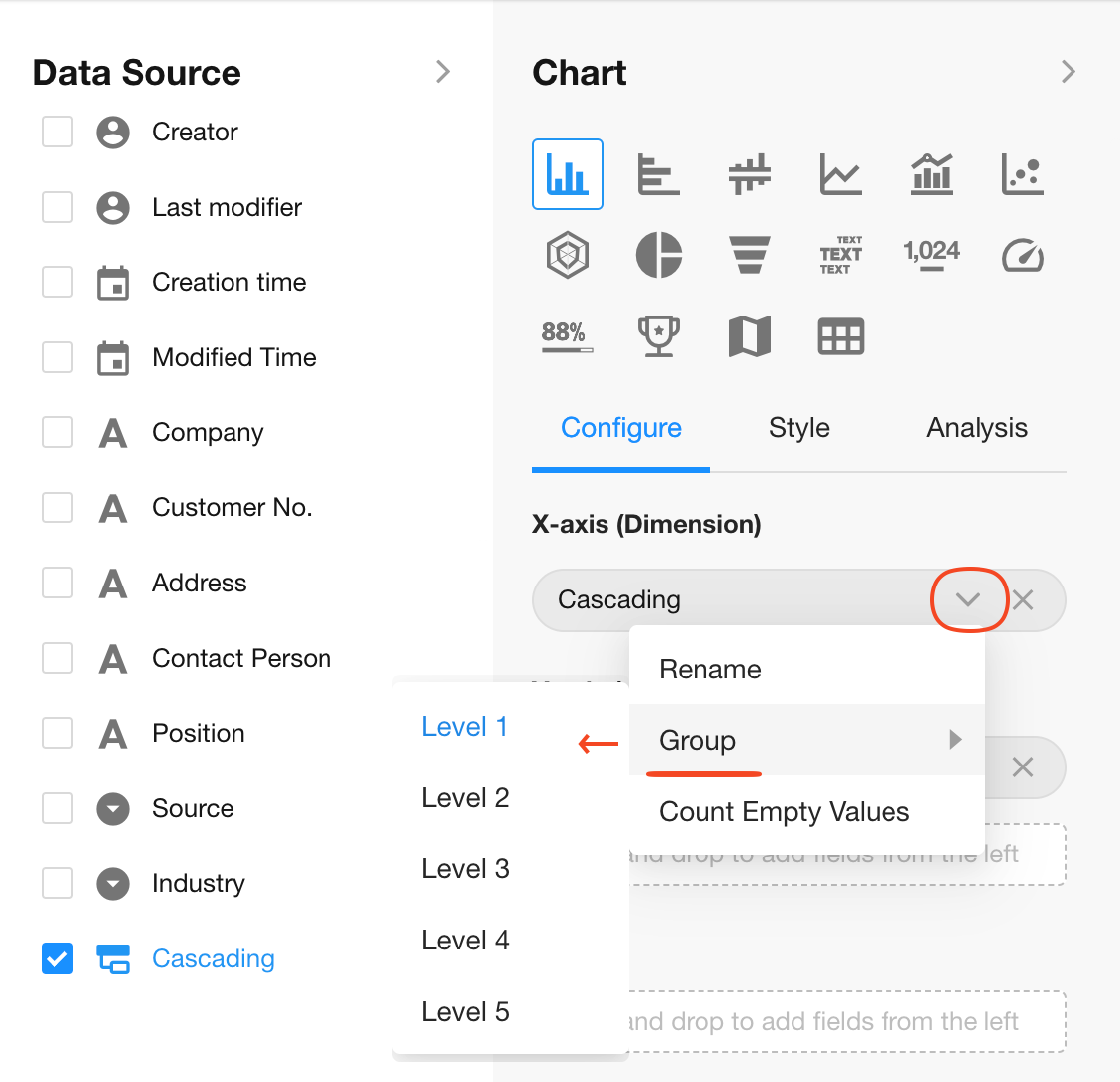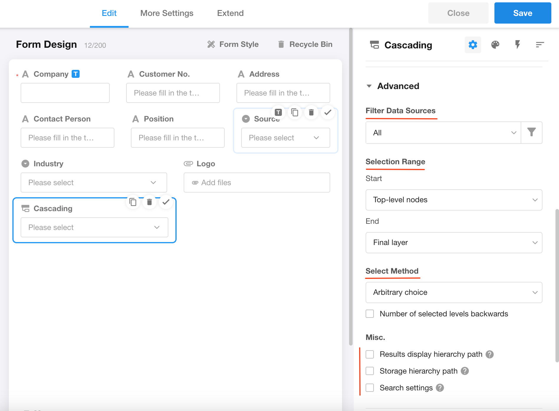 When enabled, the system will store the complete hierarchical path of the selected option at the time of selection and will not automatically synchronize subsequent changes to the path. To obtain the latest hierarchical path, you may recalibrate the cascading field. Storing the path allows users to perform hierarchical data analysis in charts.