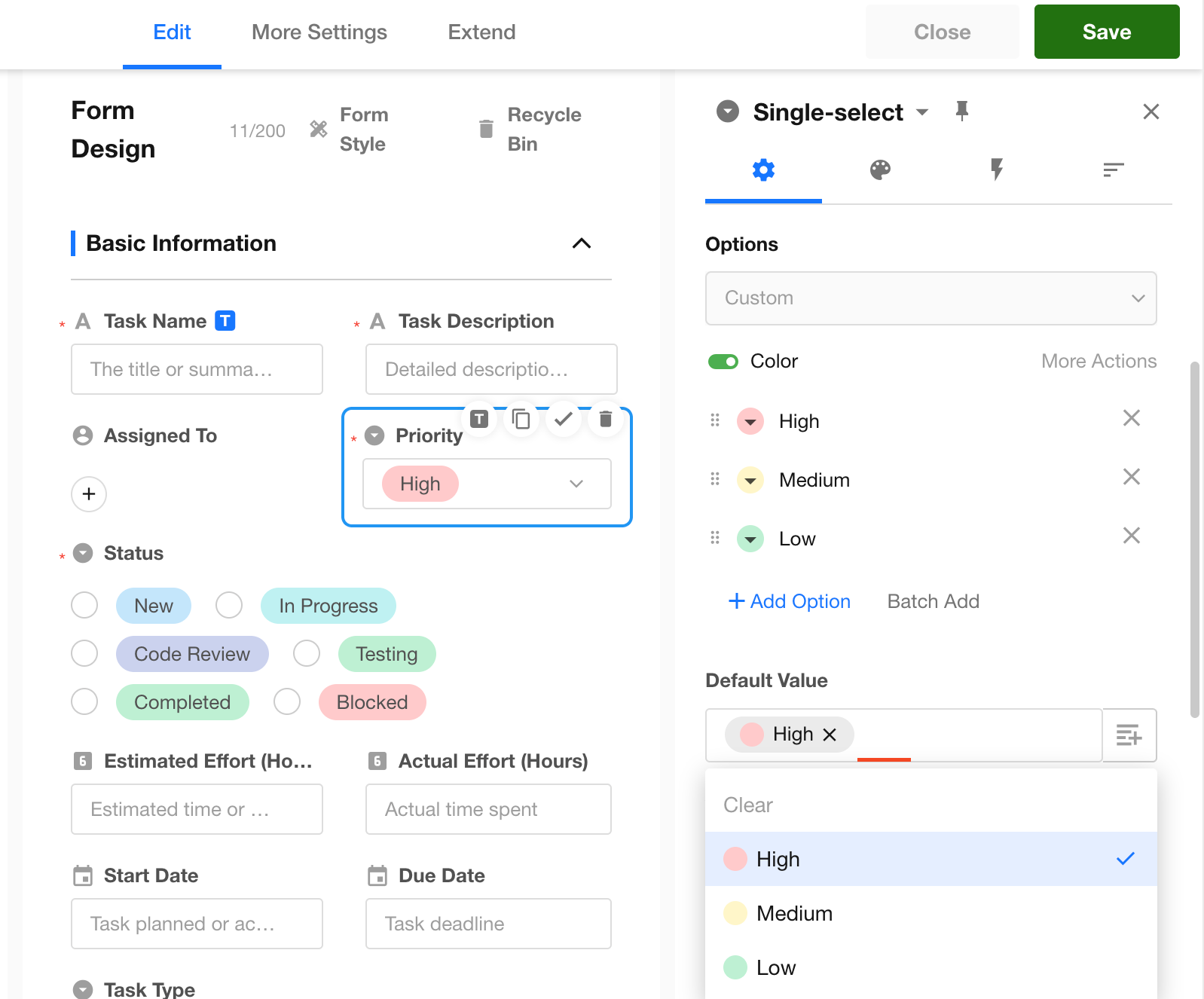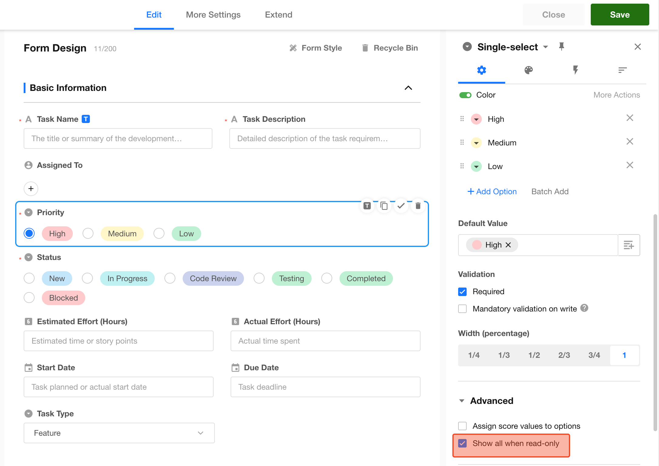 Single select and multi select fields allow users to complete input by selecting predefined options, improving data entry efficiency. Each option can also be assigned a value for use in business calculations.