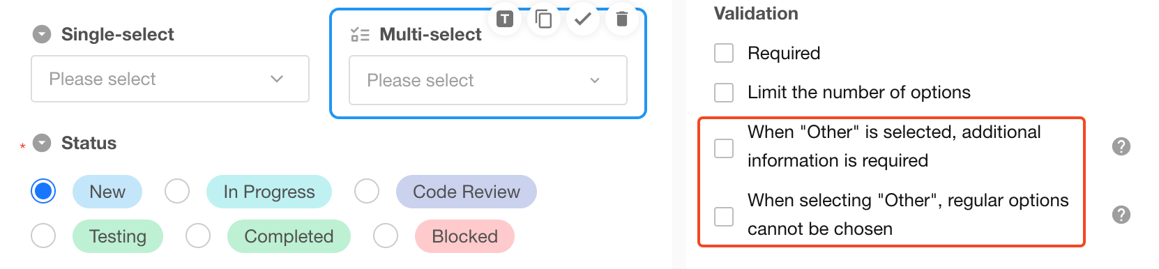 When users select Other, an input field appears for entering additional content. This input field supports customizable hint text.