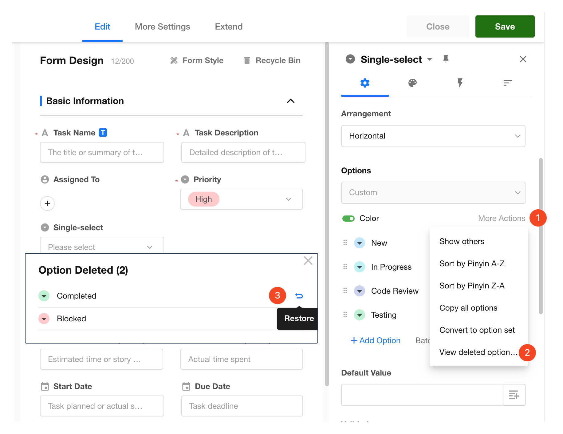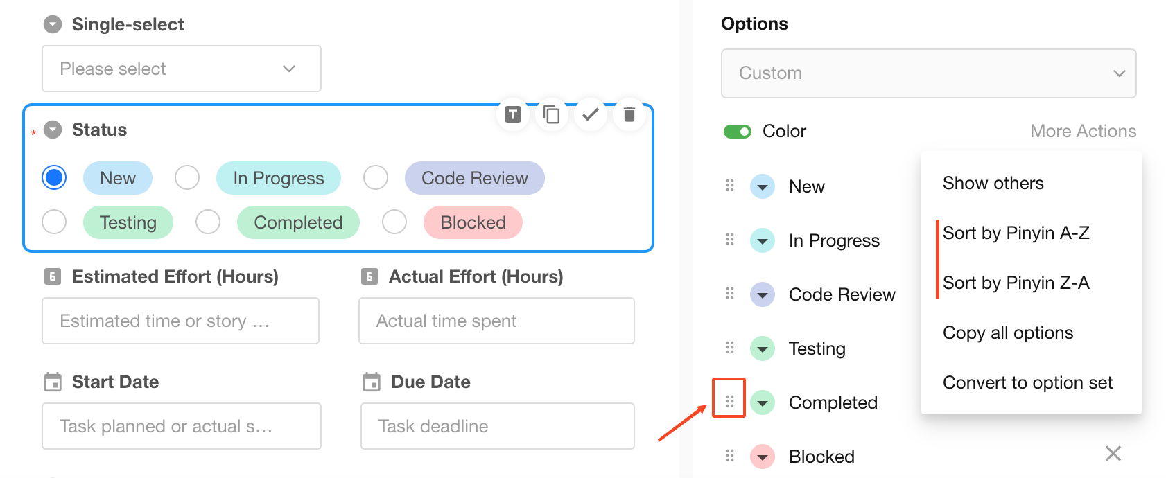 In the option list, you can drag and drop individual options to reorder them. In More Actions, you can also sort all options quickly by pinyin.