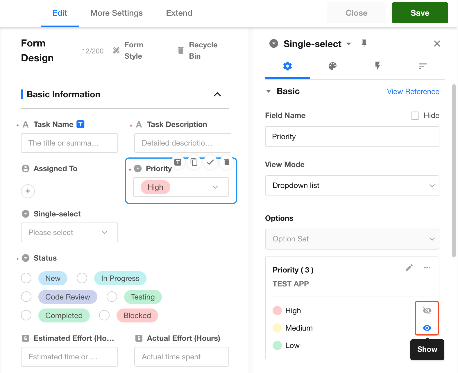 If some options in an option set are not applicable to the current field, they can be hidden. Hidden options will not be visible to users during selection.