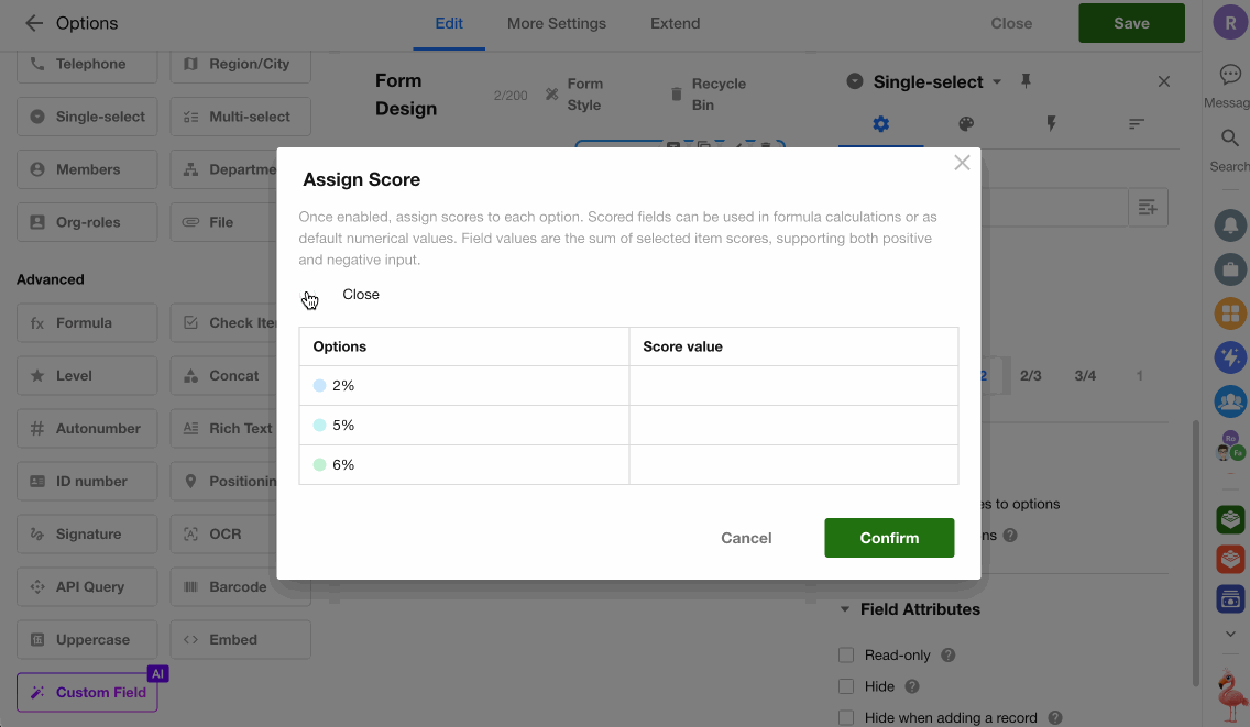 In some cases, each option may represent a numeric value. For example, when a single select field represents tax rates (1%, 3%), the actual values used in calculations should be 0.01 and 0.03. Since "1%" is text and cannot be used in calculations, assigning values (e.g., 0.01) enables proper computation.