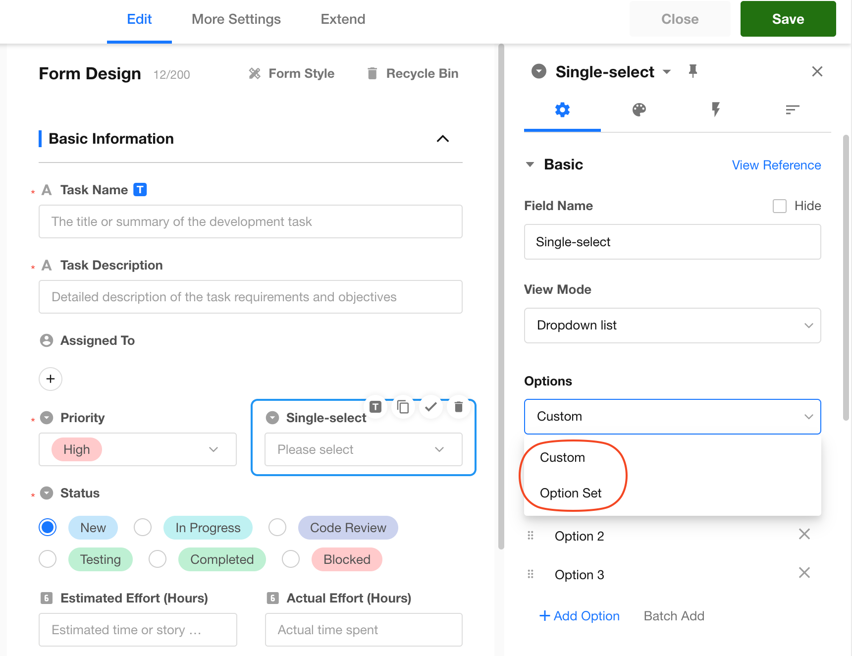 An option set is a shared option template (or data source). Single select and multi select fields can directly use an existing option set, or convert custom options into an option set for reuse across worksheets.