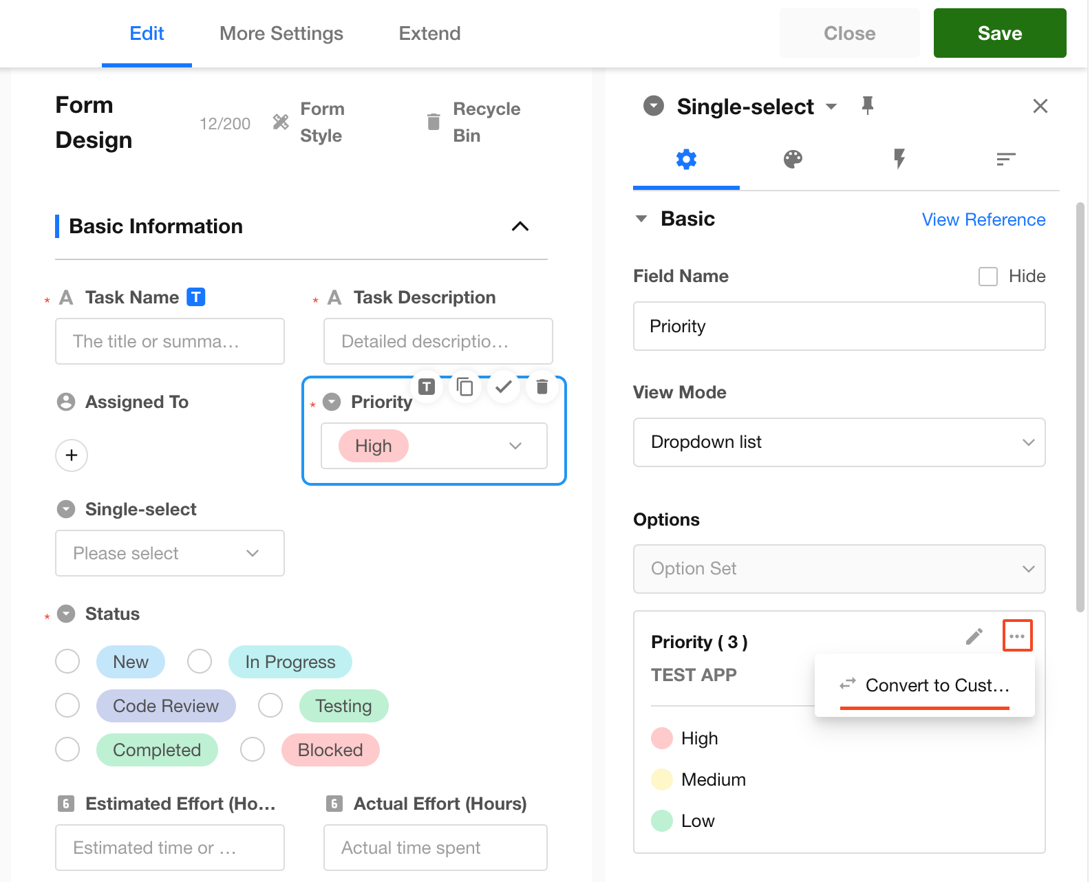 Custom options can be converted into an option set. After conversion, any edits will automatically sync to the option set. Fields in other worksheets referencing this option set will also update automatically.