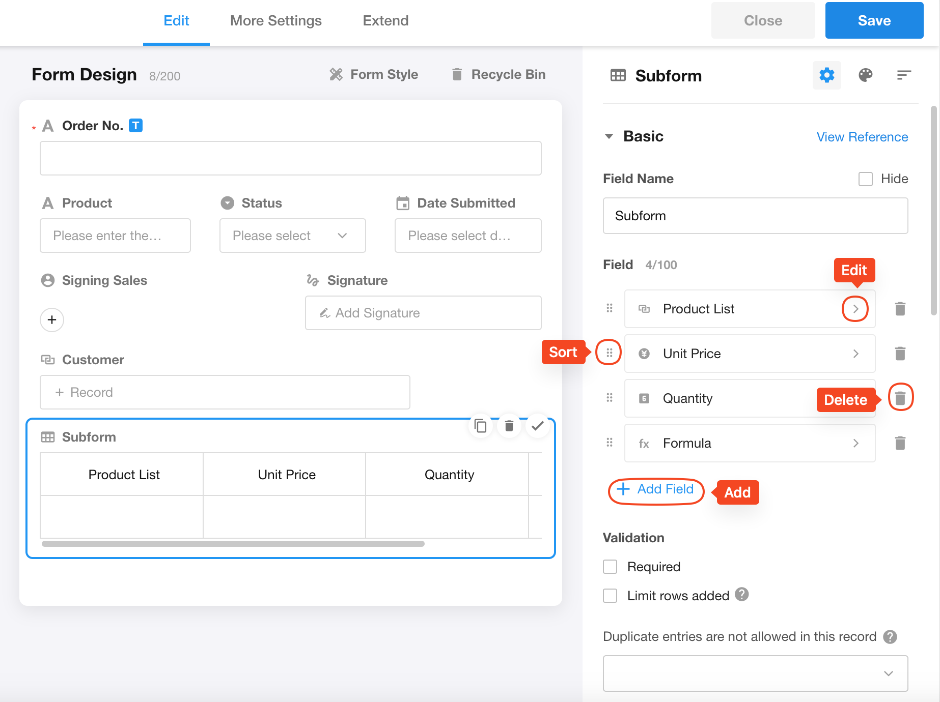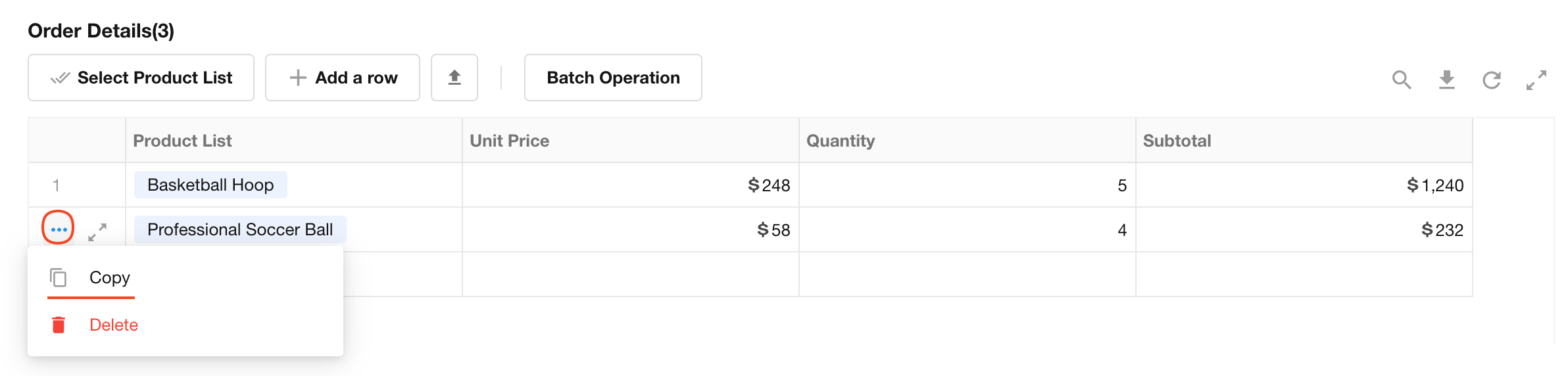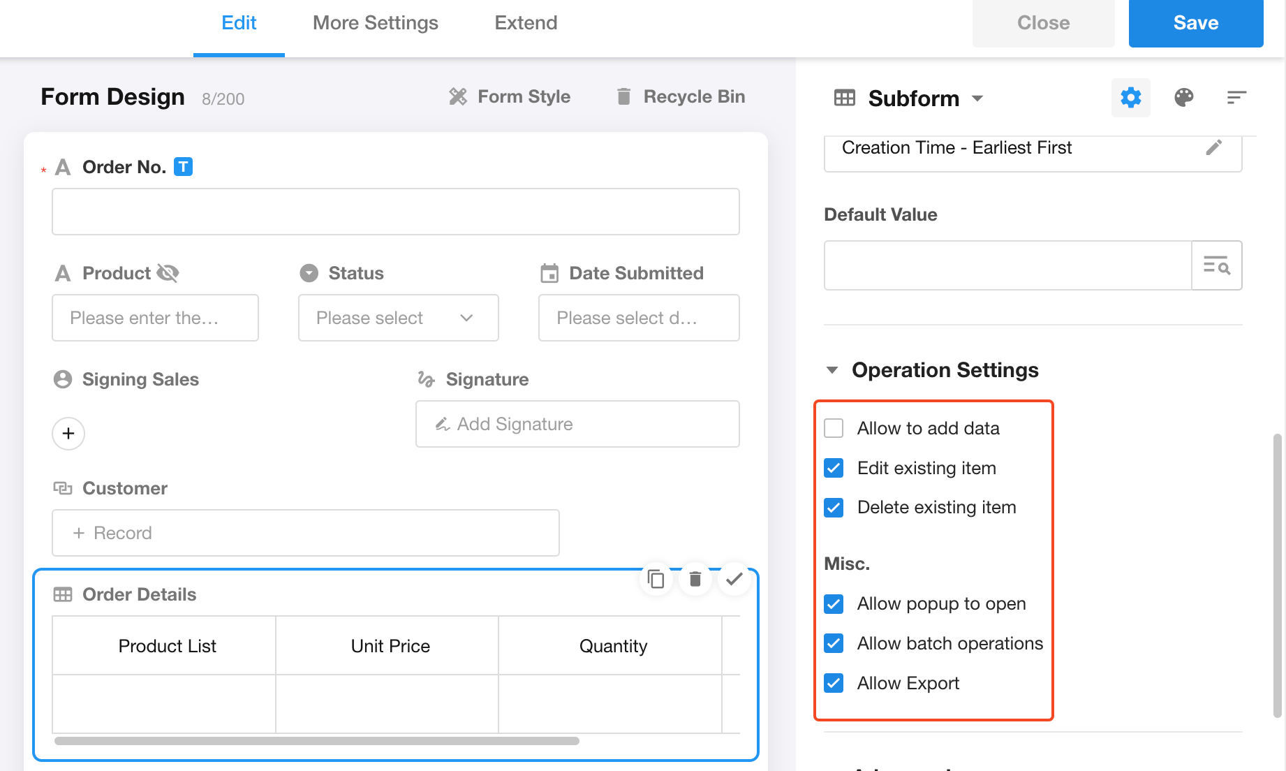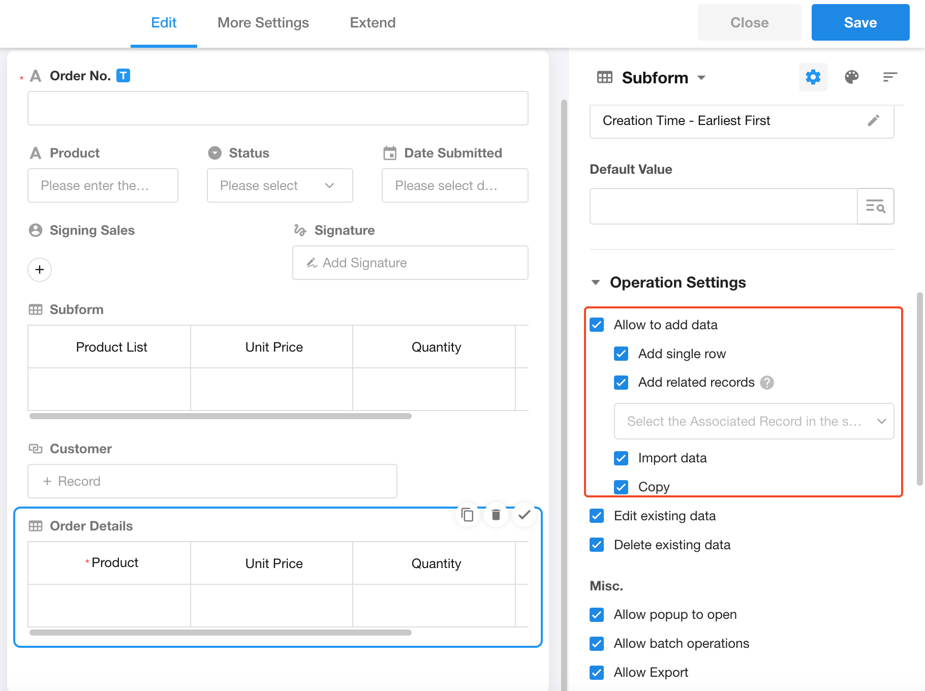 Subform data supports custom sorting rules (applied only when viewing existing records). Newly added rows always appear at the bottom initially, but will be reordered according to the sorting rules after saving.