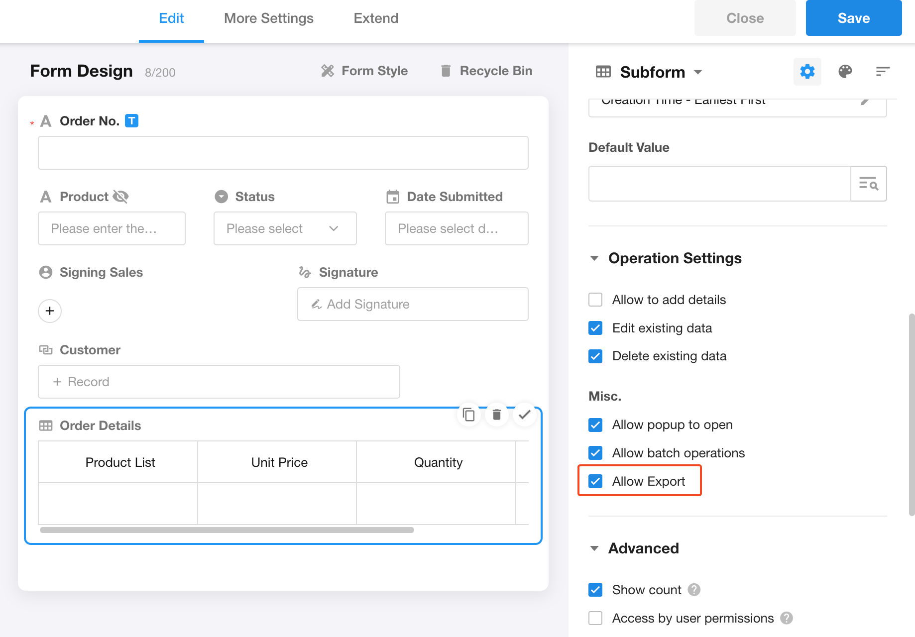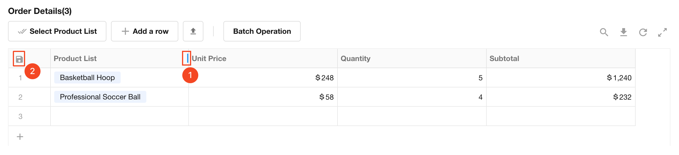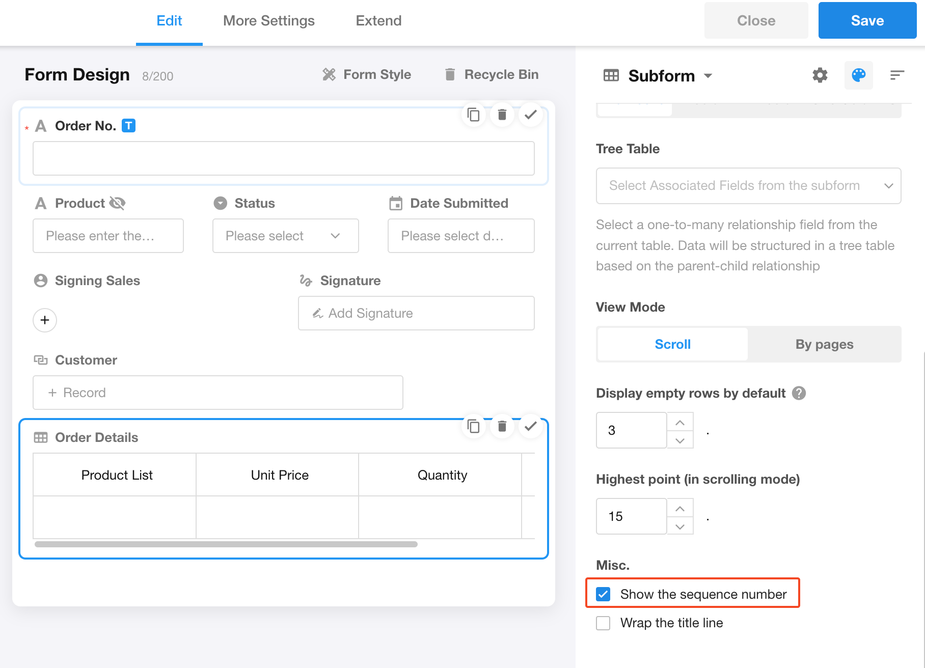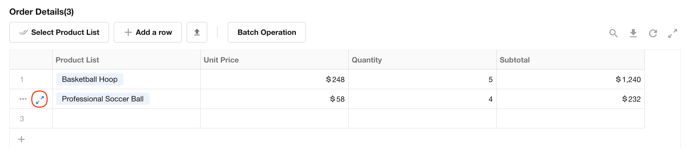Subform data supports custom sorting rules (applied only when viewing existing records). Newly added rows always appear at the bottom initially, but will be reordered according to the sorting rules after saving.