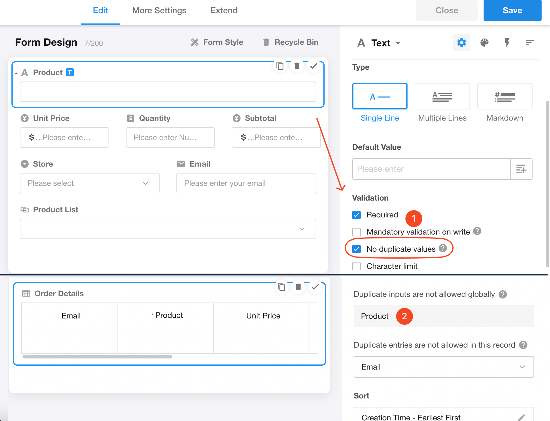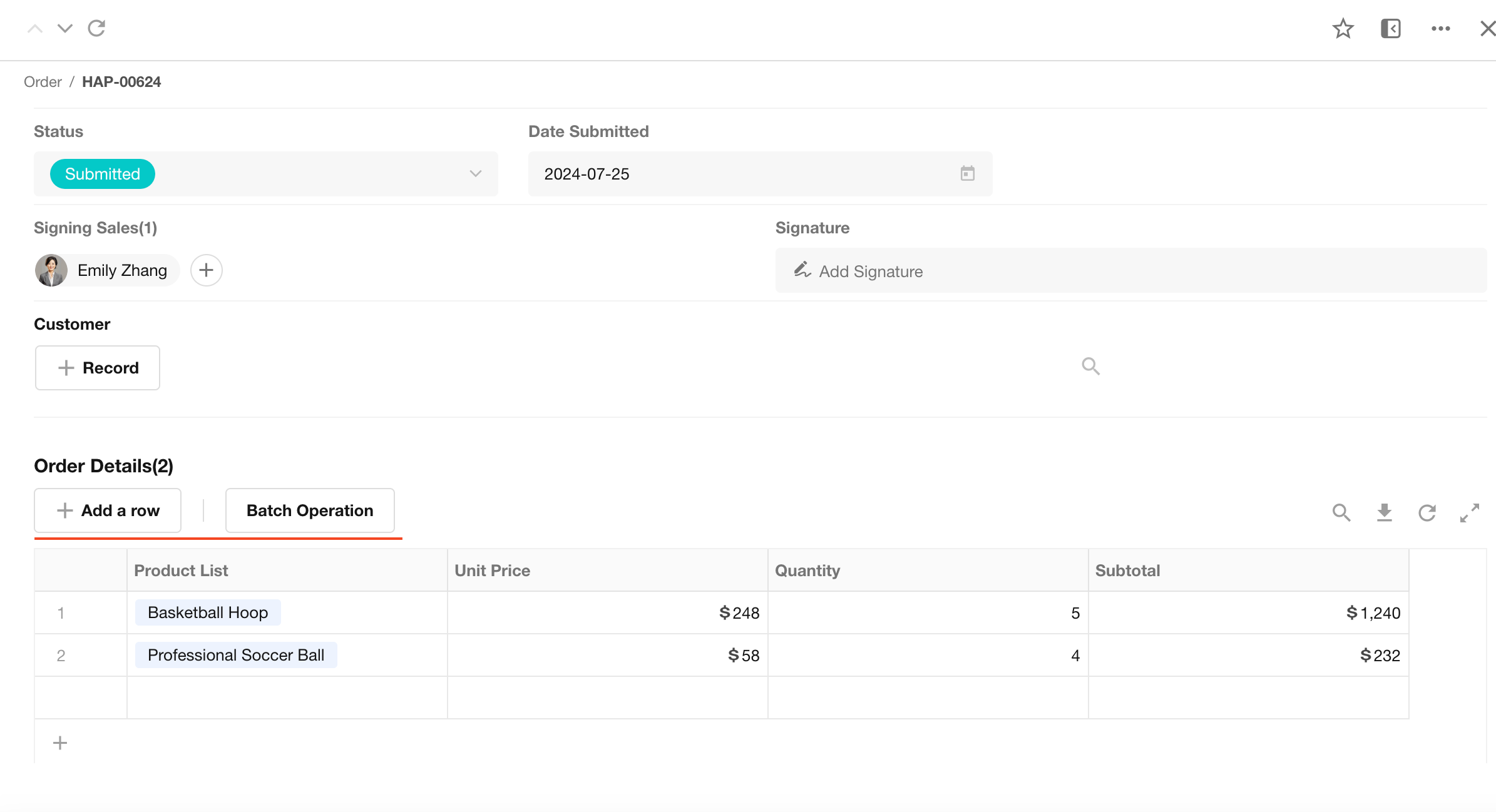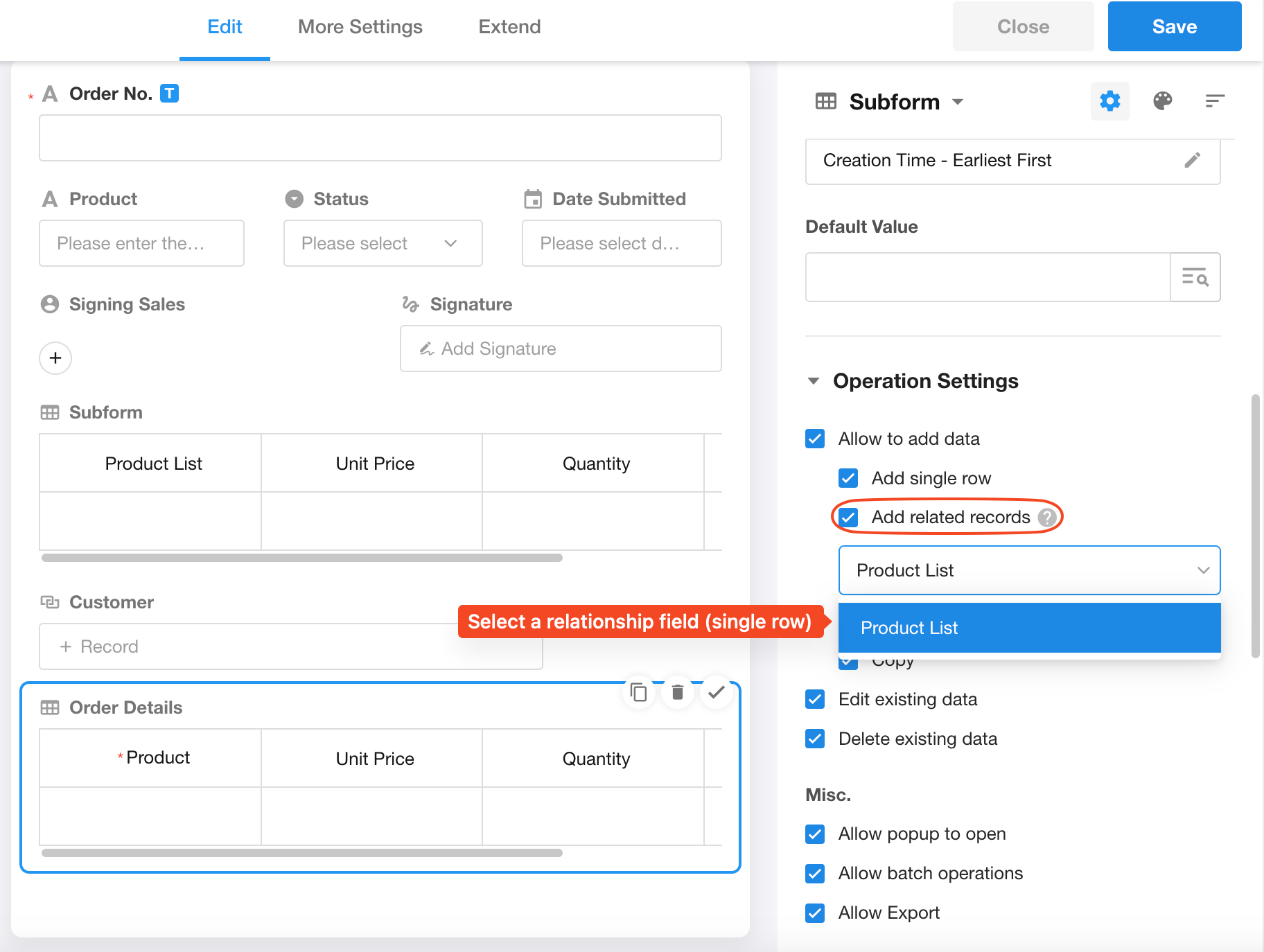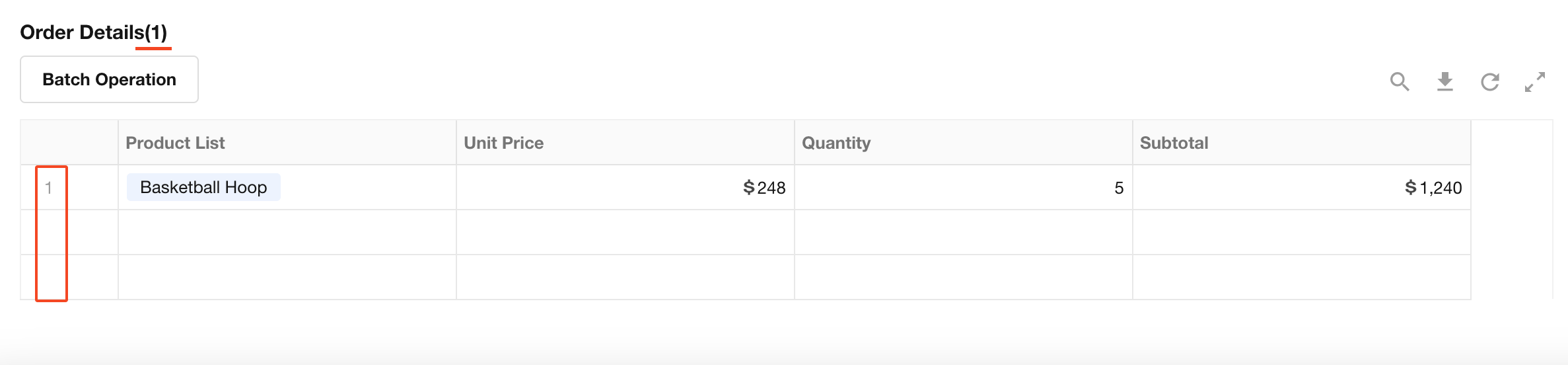 Subform data supports custom sorting rules (applied only when viewing existing records). Newly added rows always appear at the bottom initially, but will be reordered according to the sorting rules after saving.