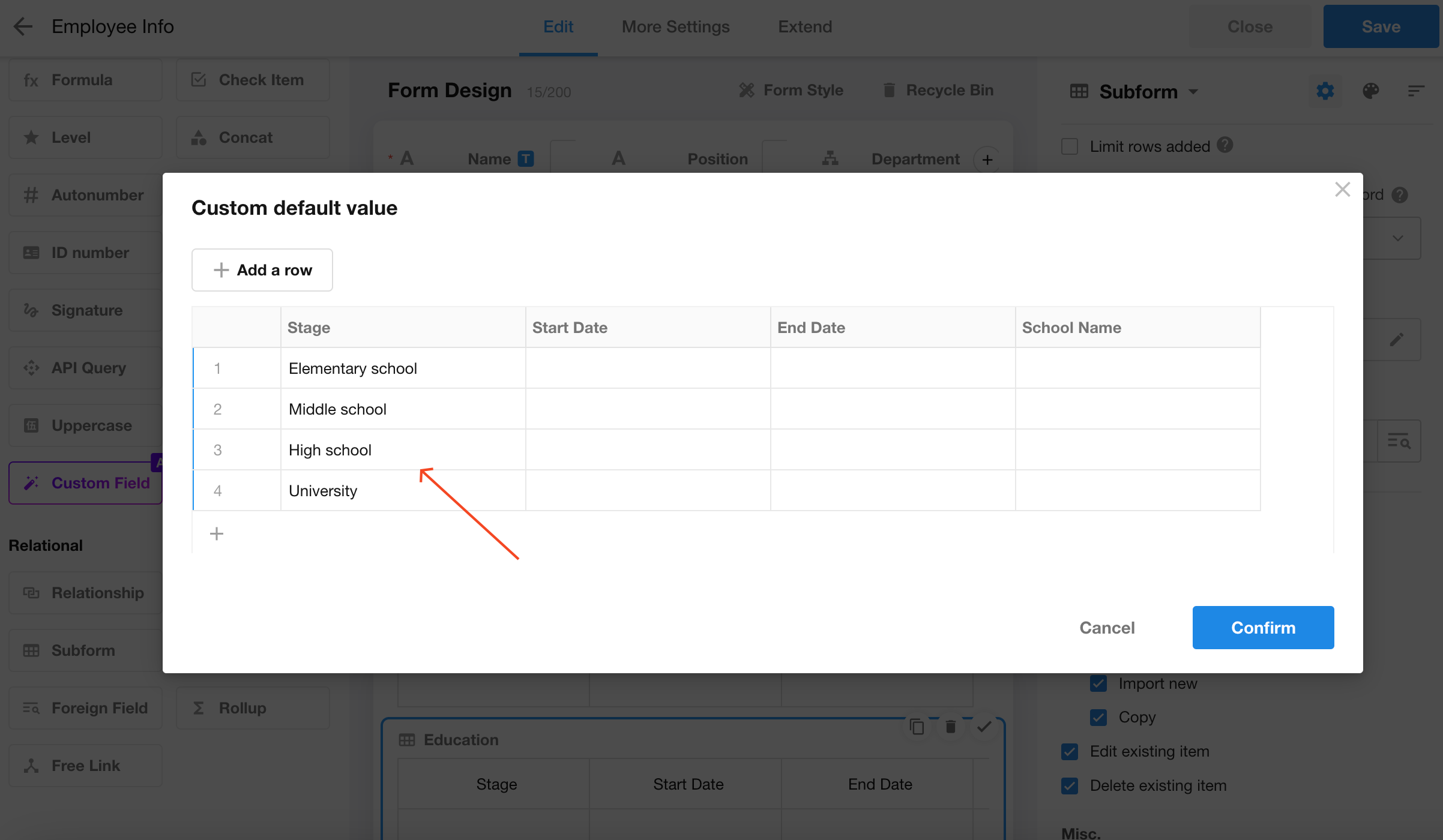 After setting default values, each time a new record is created in the main worksheet, the subform fields with default values will automatically display the preset values. For example: In an employee information worksheet containing an education experience subform (typically including elementary school, middle school, high school, and university stages), setting default values allows users to simply modify dates and school names when entering data.